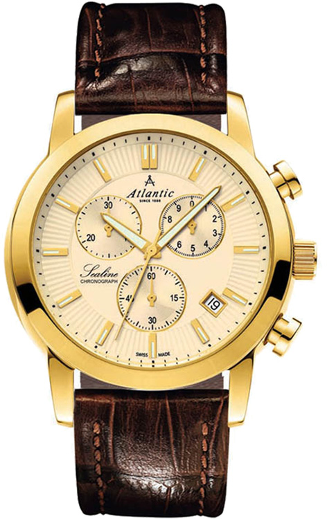 hodinky Atlantic Sealine 62450.45.31. Hodinky většího formátu s průměrem pouzdra 50 mm! Solidní zpracování, švýcarský, spolehlivý Machineek ETA a nadčasový charakter z nich dělají perfektní volbu pro gentlemana, který hledá klasické hodinky ke každému typu outfitu. Vybavený chronografem (stopkami) se jistě bude hodit pro měření nejen samotného času, ale i času měřeného při běhu nebo na kole a díky safírovému sklíčku se již nebudete muset bát poškrábání.