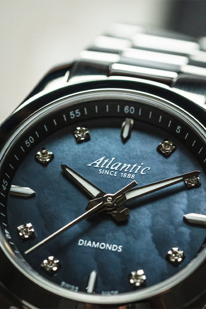 Model Atlantic 20335.41.07BK zaujme třpytivým číselníkem z tmavé perleti, na kterém jsou umístěny průhledné diamanty doprovázející luminiscenční indexy a ručičky. Každý prvek je obklopen elegantním stříbrným obrysem. Celý je chráněn safírovým sklíčkem, které je maximálně odolné proti poškrábání. Pouzdro 28,5 mm má krásnou leštěnou lunetu a stejně jako třířadý náramek je vyrobeno z nerezové oceli. Hodinky s certifikovanými diamanty Atlantic z kolekce Seapair Lady jsou poháněny přesným quartzovým Machinekem (na baterie). Hodinky nesou renomovanou značku kvality Swiss Made.