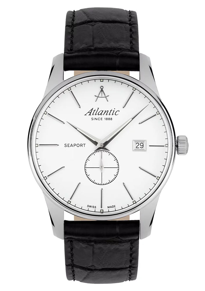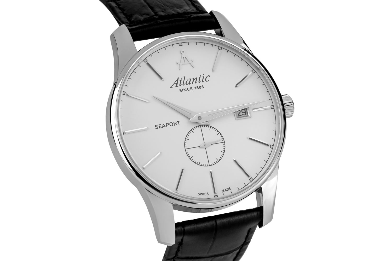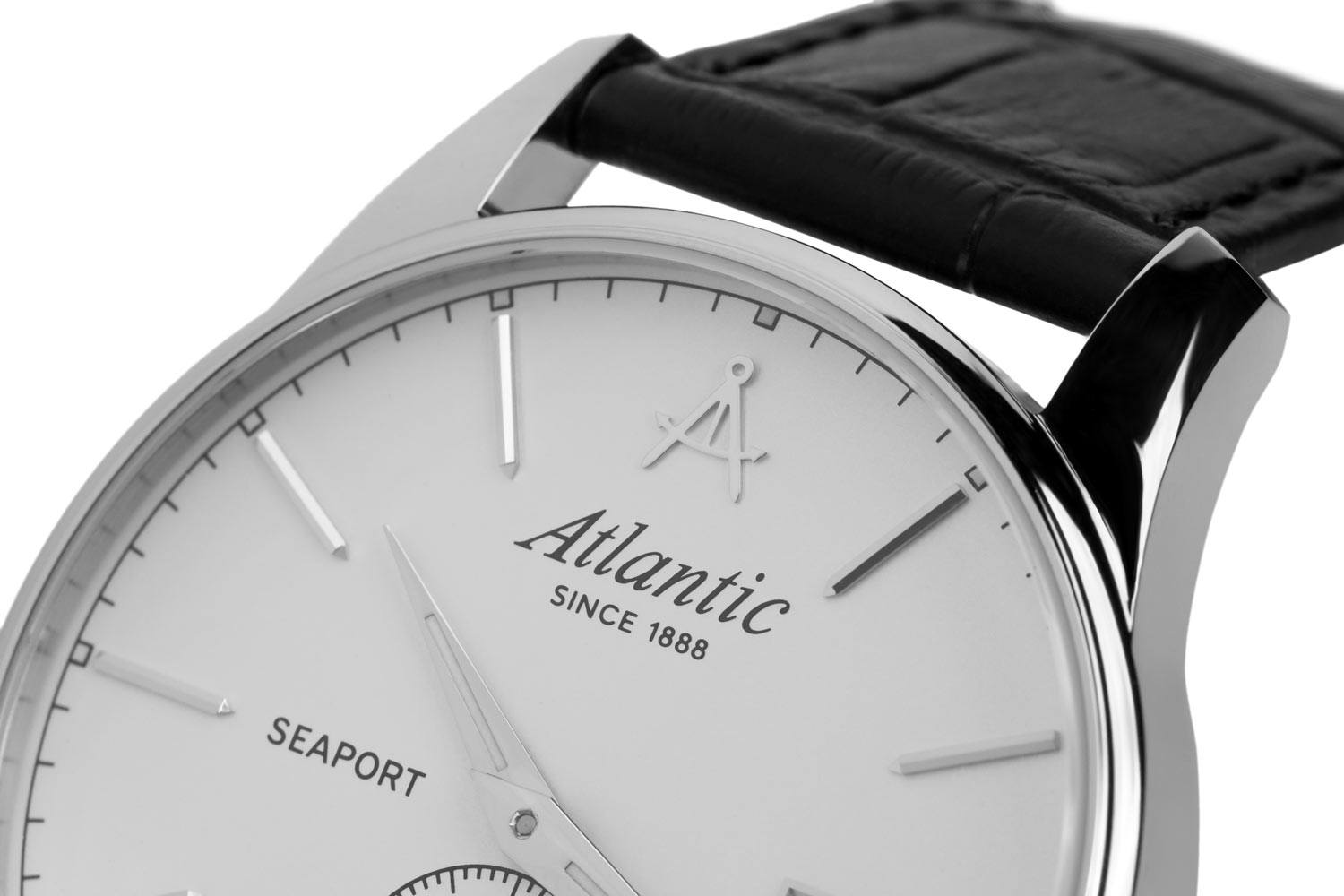 Přední stranu tvoří jasně tenký rámeček, který efektivně zvětšuje oblast ciferníku. Safírové sklíčko odolné proti poškrábání chrání modrý ciferník, který se vyznačuje minimalismem a čitelností. Ciferník má tenké a ostré ručičky a dlouhé ocelové indexy. Šest hodin je vyhrazeno sekundovému subciferníku. Ve dvanáct hodin je logo značky Atlantic, které připomíná kompasy lodního navigátora. Funkčnost je obohacena o datumovku, která ve tři hodiny indikuje aktuální den v měsíci. Hodinky Atlantic na koženém řemínku pohání švýcarský mechanismus Ronda. Hodinky Atlantic z kolekce Seaport budou perfektní volbou pro fanouška jachtingu. Tyto hodinky budou dobrou volbou doplňku jak pro každodenní použití, tak pro speciální příležitosti.