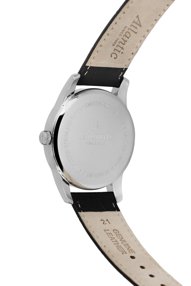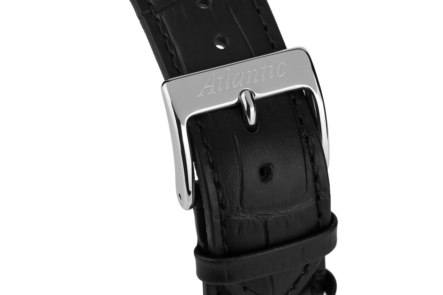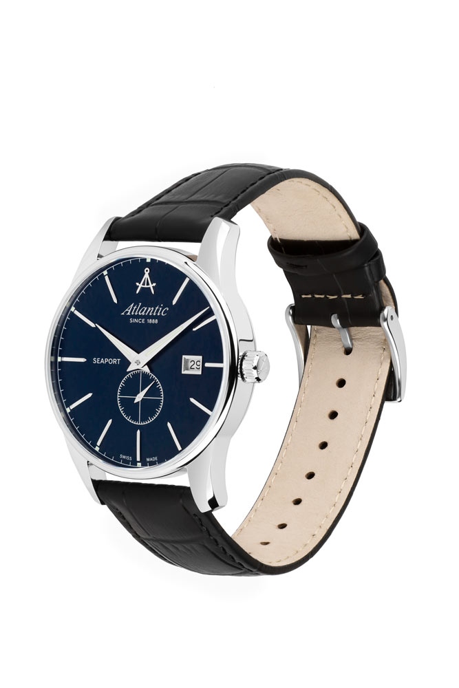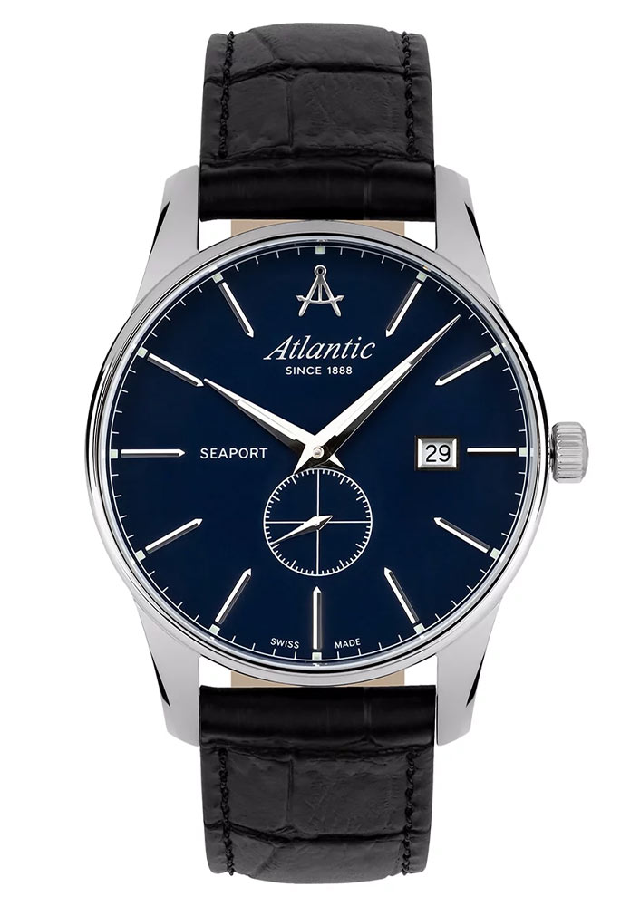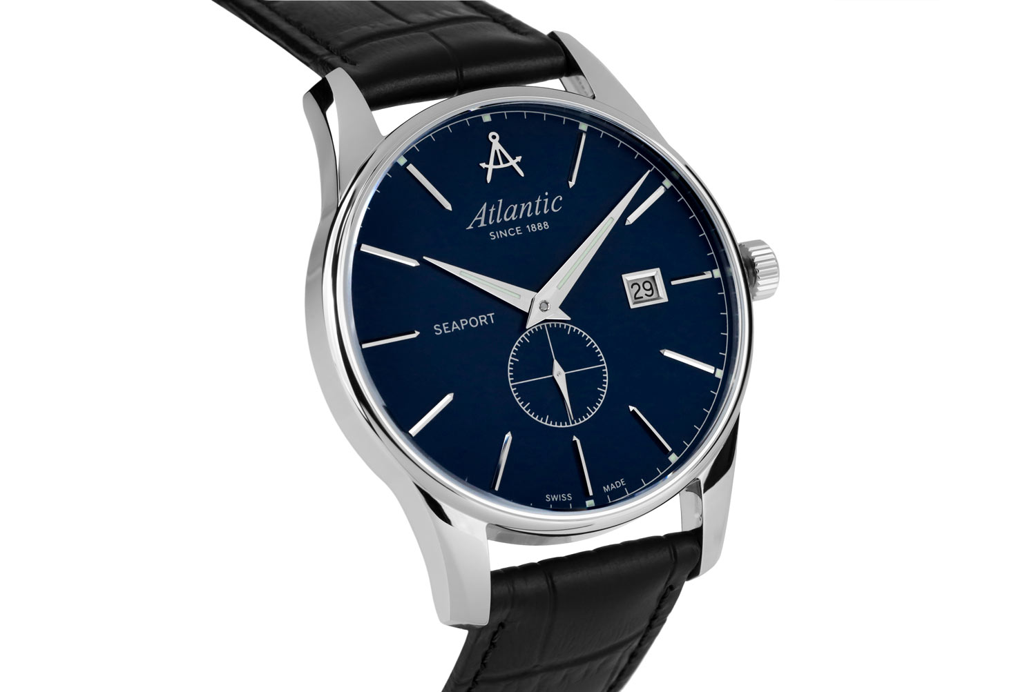 Přední stranu tvoří jasně tenký rámeček, který efektivně zvětšuje oblast ciferníku. Safírové sklíčko odolné proti poškrábání chrání modrý ciferník, který se vyznačuje minimalismem a čitelností. Ciferník má tenké a ostré ručičky a dlouhé ocelové indexy. Šest hodin je vyhrazeno sekundovému subciferníku. Ve dvanáct hodin je logo značky Atlantic, které připomíná kompasy lodního navigátora. Funkčnost je obohacena o datumovku, která ve tři hodiny indikuje aktuální den v měsíci. Hodinky Atlantic na koženém řemínku pohání švýcarský mechanismus Ronda. Hodinky Atlantic z kolekce Seaport budou perfektní volbou pro fanouška jachtingu. Tyto hodinky budou dobrou volbou doplňku jak pro každodenní použití, tak pro speciální příležitosti.