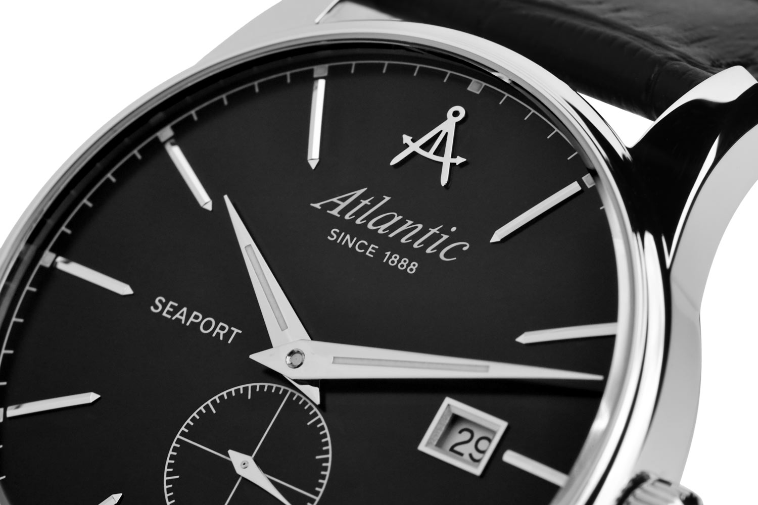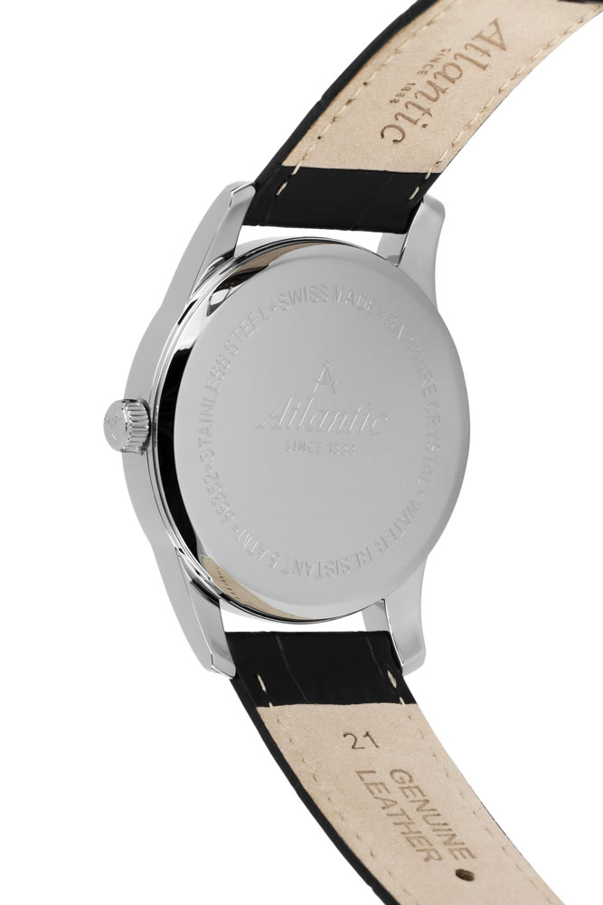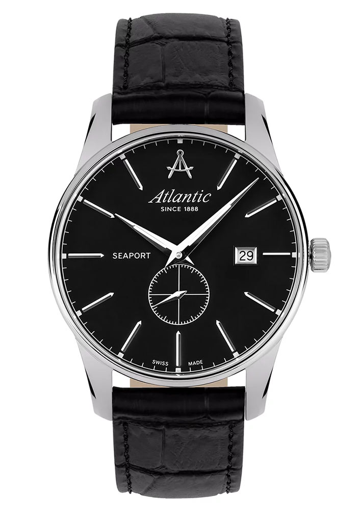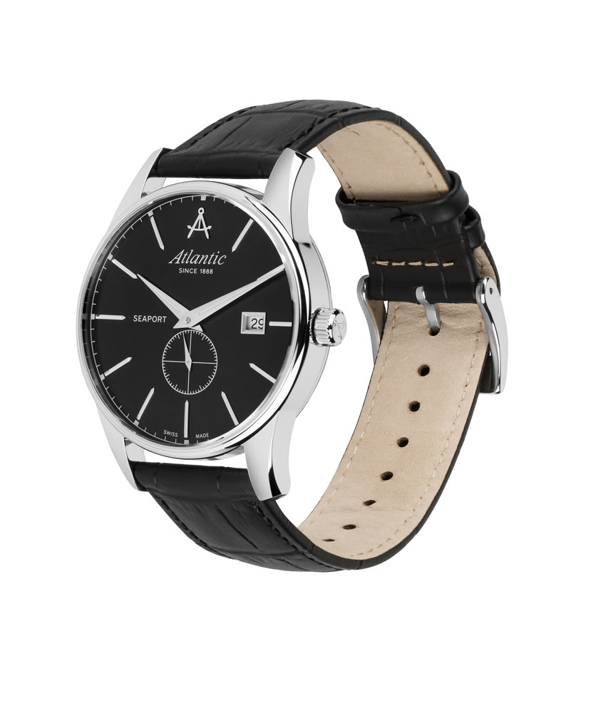 Přední stranu tvoří jasně tenký rámeček, který efektivně zvětšuje oblast ciferníku. Safírové sklo odolné proti poškrábání chrání černý ciferník, který se vyznačuje minimalismem a čitelností. Ciferník má tenké, ostré ručičky a dlouhé ocelové indexy. Šest hodin je vyhrazeno sekundovému subciferníku. Ve dvanáct hodin je logo značky Atlantic, které připomíná kompasy lodního navigátora. Funkčnost je obohacena o datumovku, která ve tři hodiny indikuje aktuální den v měsíci. Hodinky Atlantic na koženém řemínku pohání švýcarský mechanismus Ronda. Hodinky Atlantic z kolekce Seaport budou perfektní volbou pro fanouška jachtingu. Tyto hodinky budou dobrou volbou doplňku jak pro každodenní použití, tak pro speciální příležitosti.