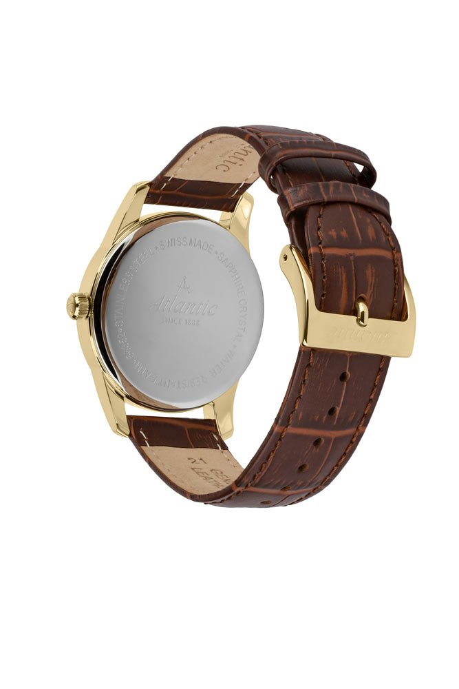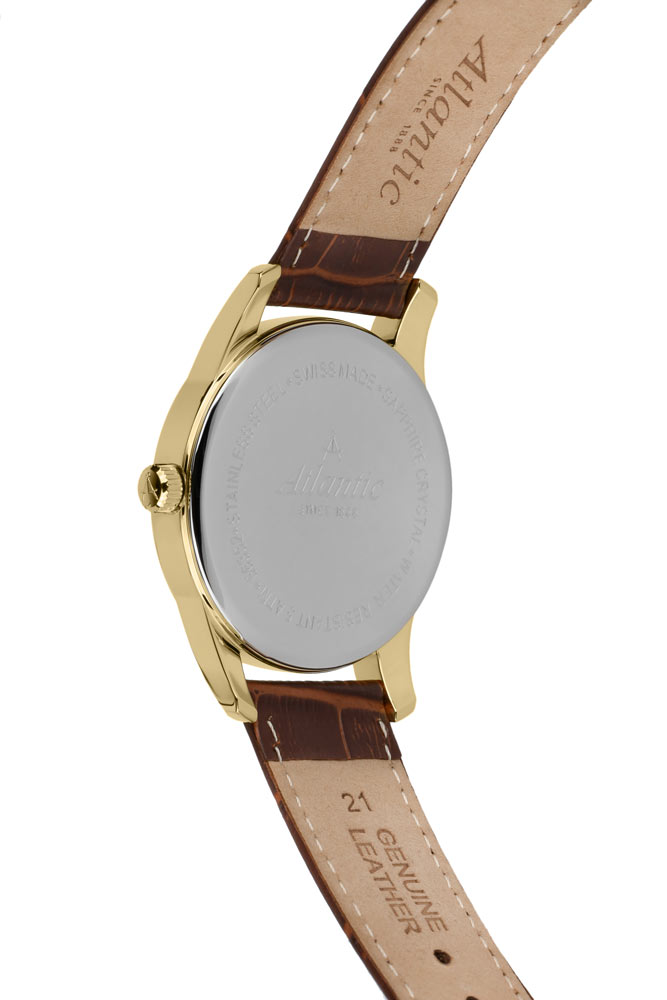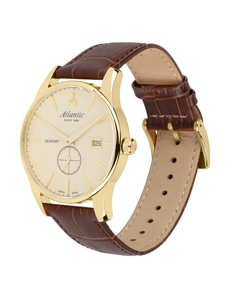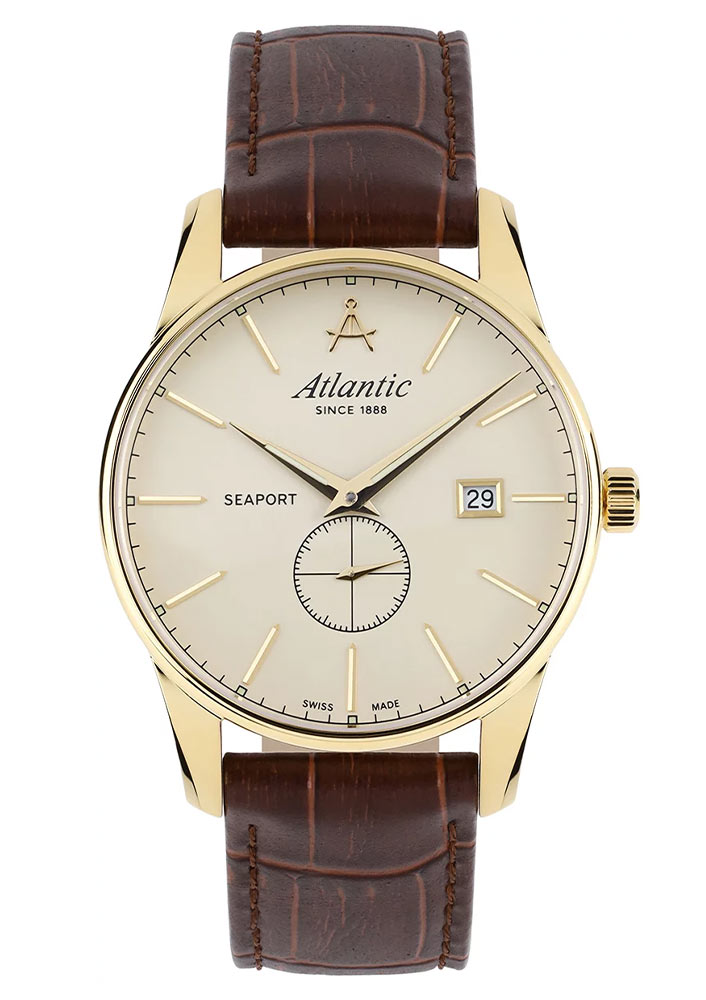 Přední stranu tvoří jasně tenký rámeček, který efektivně zvětšuje oblast ciferníku. Safírové sklíčko odolné proti poškrábání chrání béžový ciferník, který se vyznačuje minimalismem a čitelností. Ciferník má pozlacené, tenké a ostré ručičky a dlouhé ocelové indexy. Šest hodin je vyhrazeno sekundovému subciferníku. Ve dvanáct hodin je logo značky Atlantic, které připomíná kompasy lodního navigátora. Funkčnost je obohacena o datumovku, která ve tři hodiny ukazuje aktuální den v měsíci. Hodinky Atlantic na koženém řemínku pohání švýcarský mechanismus Ronda. Hodinky Atlantic z kolekce Seaport budou perfektní volbou pro fanouška jachtingu. Tyto hodinky budou dobrou volbou doplňku jak pro každodenní použití, tak pro speciální příležitosti.