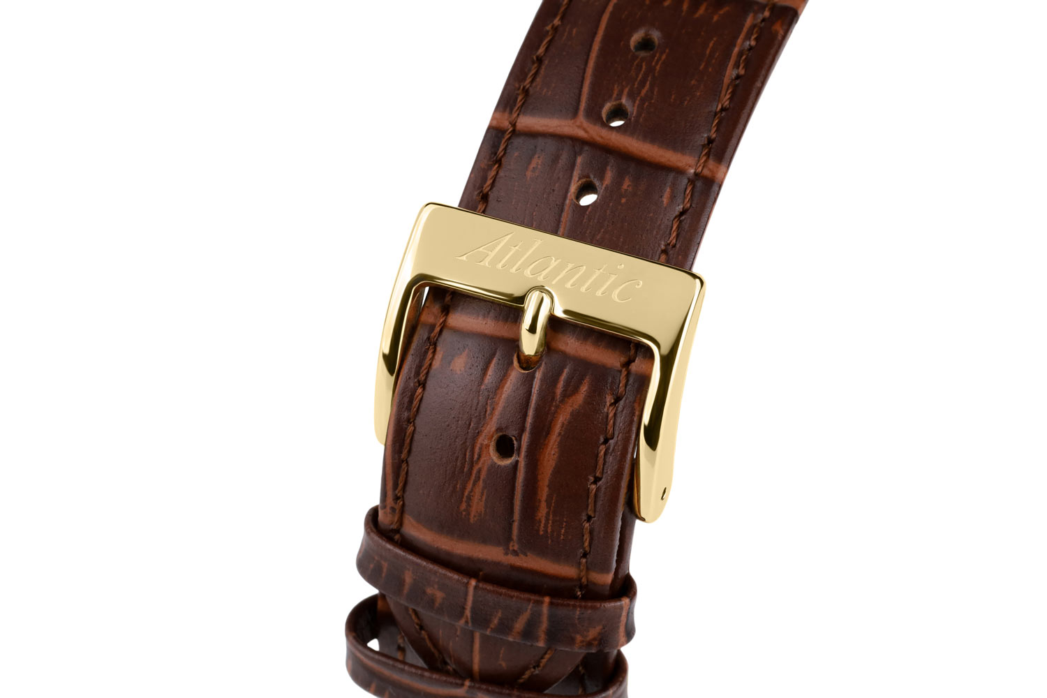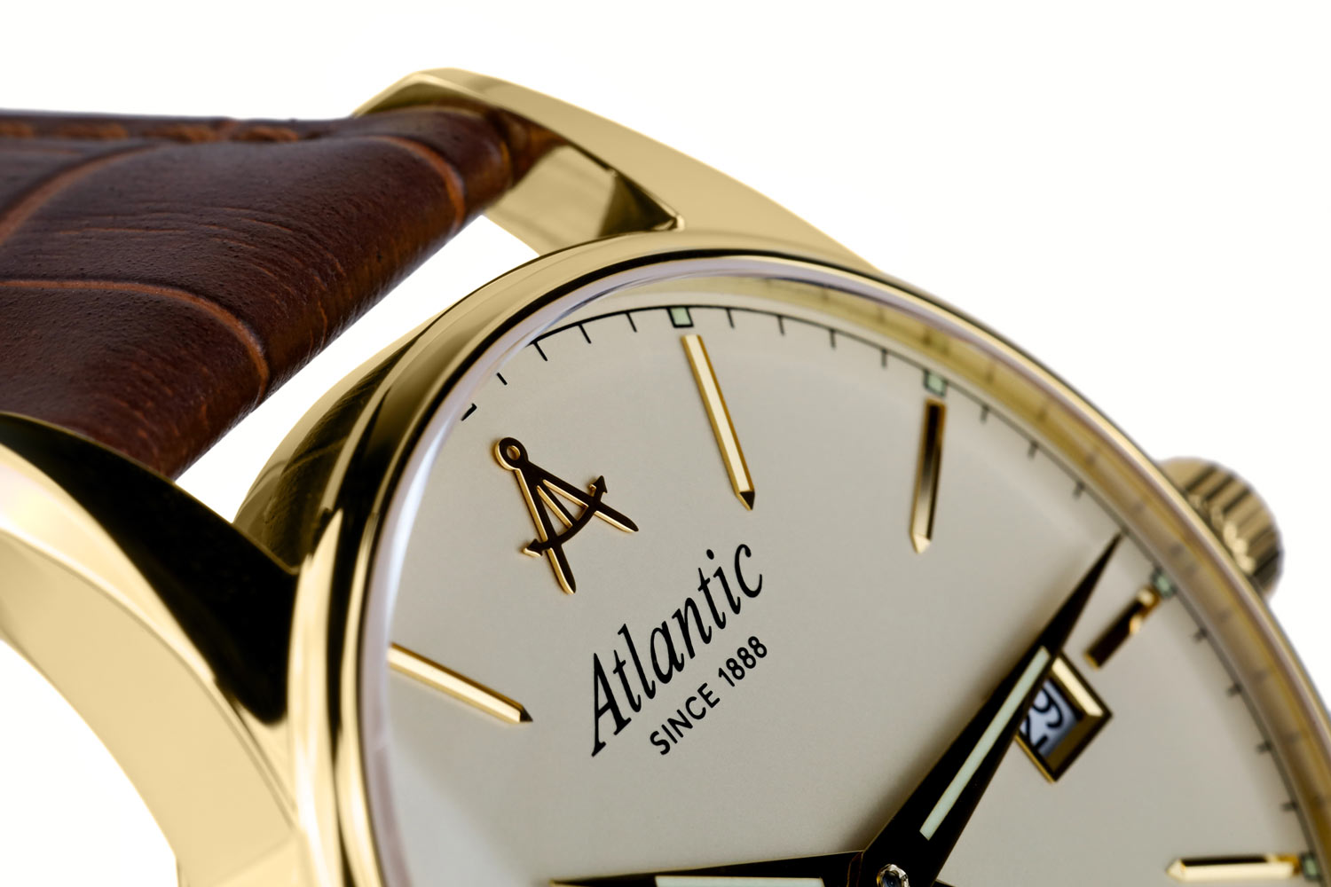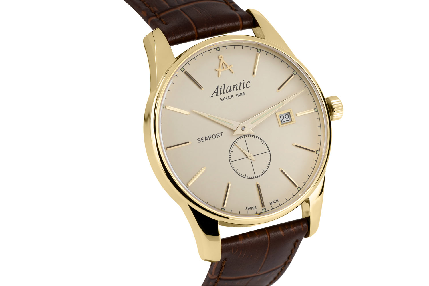 Přední stranu tvoří jasně tenký rámeček, který efektivně zvětšuje oblast ciferníku. Safírové sklíčko odolné proti poškrábání chrání béžový ciferník, který se vyznačuje minimalismem a čitelností. Ciferník má pozlacené, tenké a ostré ručičky a dlouhé ocelové indexy. Šest hodin je vyhrazeno sekundovému subciferníku. Ve dvanáct hodin je logo značky Atlantic, které připomíná kompasy lodního navigátora. Funkčnost je obohacena o datumovku, která ve tři hodiny ukazuje aktuální den v měsíci. Hodinky Atlantic na koženém řemínku pohání švýcarský mechanismus Ronda. Hodinky Atlantic z kolekce Seaport budou perfektní volbou pro fanouška jachtingu. Tyto hodinky budou dobrou volbou doplňku jak pro každodenní použití, tak pro speciální příležitosti.