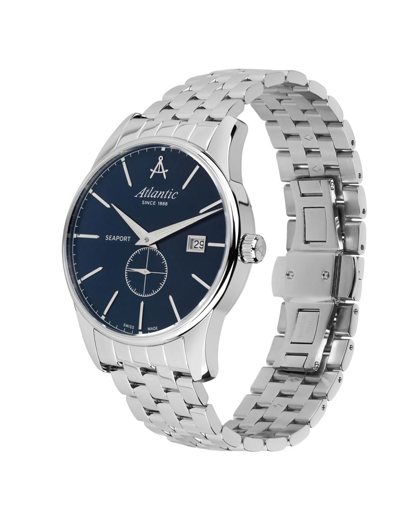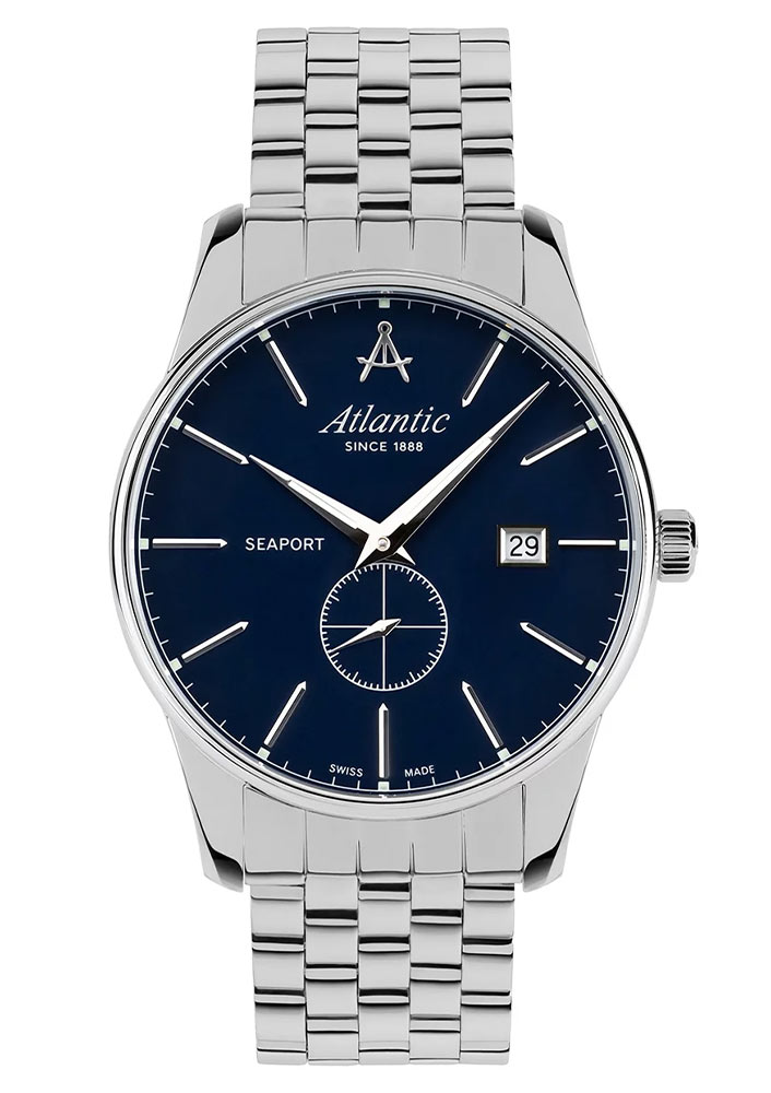 Přední stranu tvoří jasně tenký rámeček, který efektivně zvětšuje oblast ciferníku. Safírové sklo odolné proti poškrábání chrání modrý ciferník, který se vyznačuje minimalismem a čitelností. Ciferník má tenké, ostré ručičky a dlouhé ocelové indexy. Šest hodin je vyhrazeno sekundovému subciferníku. Ve dvanáct hodin je logo značky Atlantic, které připomíná kompasy lodního navigátora. Funkčnost je obohacena o datumovku, která ve tři hodiny indikuje aktuální den v měsíci. Hodinky Atlantic z kolekce Seaport budou perfektní volbou pro fanouška jachtingu. Tyto hodinky budou dobrou volbou doplňku jak pro každodenní použití, tak pro speciální příležitosti.