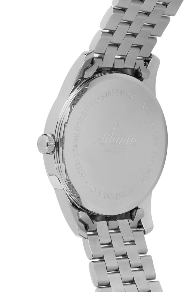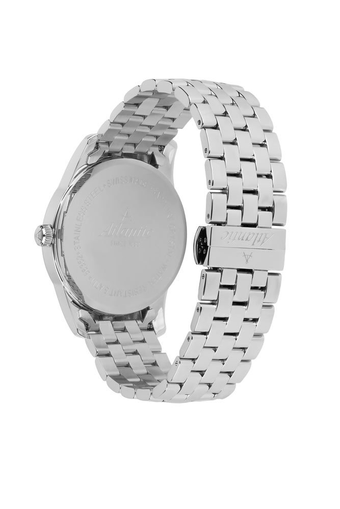 Pánské hodinky Atlantic Seaport 563574151 jsou dostupné ve velikosti 41 mm. Tyto hodinky se vyznačují malou tloušťkou pouzdra, která je pouze 10 mm. Tyto hodinky lze snadno schovat pod manžetu elegantní nebo sportovní košile. Výrobce své hodinky spároval se stříbrným ocelovým náramkem. Náramek je opatřen bezpečným a pohodlným motýlkovým zapínáním se dvěma knoflíky. Náramkové hodinky Atlantic jsou poháněny švýcarským mechanismem Ronda.