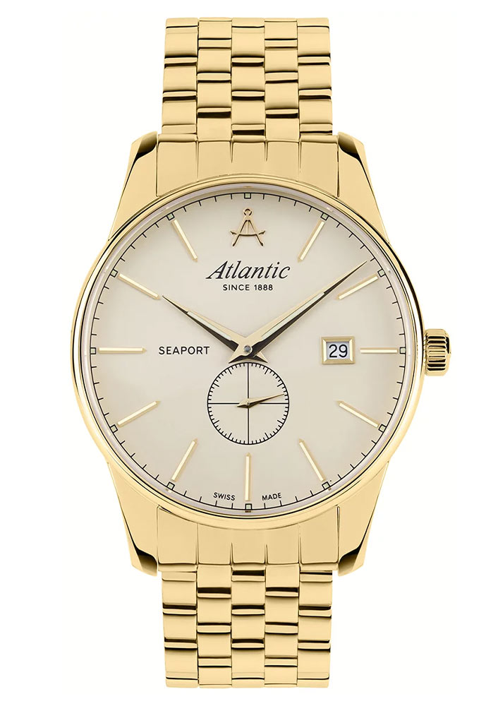 Přední část hodinek tvoří výrazně tenká luneta, která účinně zvětšuje plochu ciferníku. Safírové sklíčko odolné proti poškrábání chrání béžový ciferník, který se vyznačuje minimalismem a jasností čtení. Na ciferníku jsou umístěny štíhlé a ostré ručičky a dlouhé ocelové indexy. Šestá hodina je vyhrazena pro subciferník sekundovky. Na dvanácté hodině se nachází logo značky Atlantic, které připomíná kružítko navigátora lodi. Funkčnost obohacuje datumovka, která na třetí hodině ukazuje aktuální den v měsíci. Časoměr Atlantic z kolekce Seaport bude skvělou volbou pro fanouška jachtingu. Tyto hodinky budou dobrým výběrem jak pro každodenní nošení, tak pro výjimečné příležitosti.