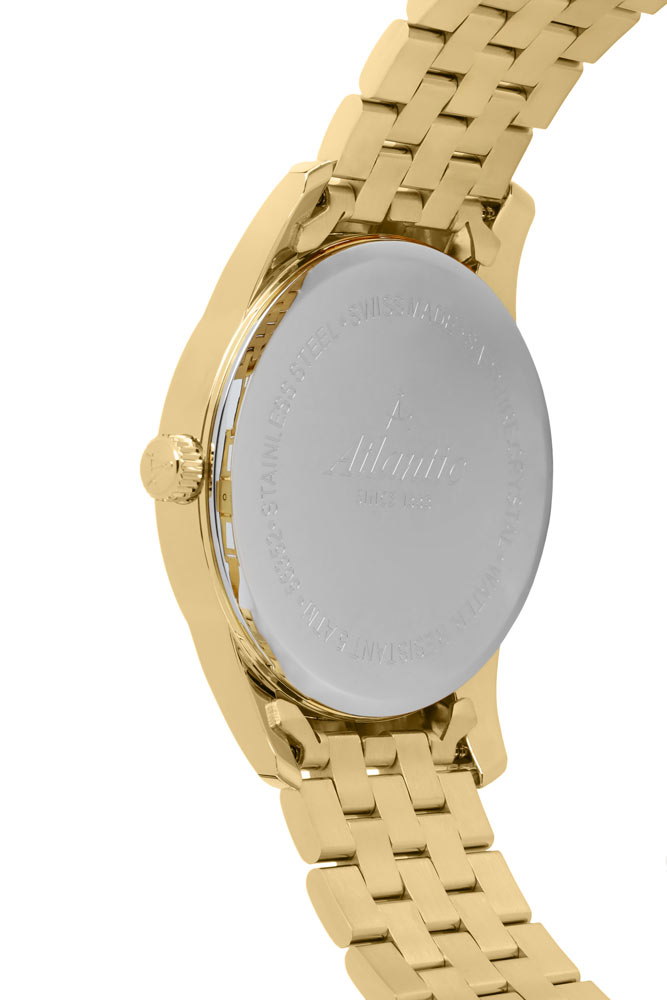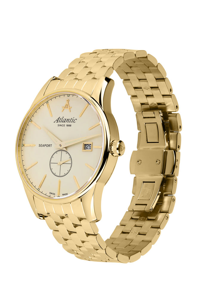 Pozlacené pánské hodinky Atlantic Seaport 563574531 jsou nabízeny ve velikosti 41 mm. Tento časoměr se vyznačuje malou tloušťkou pouzdra, která dosahuje pouze 10 mm. Hodinky se snadno skryjí pod manžetou elegantní i sportovní košile. Výrobce spojil tento model s ocelovým náramkem ve zlaté barvě. Náramek je vybaven bezpečným a pohodlným motýlkovým zapínáním na dva tlačítka. Hodinky Atlantic na náramku jsou poháněny švýcarským strojkem Ronda.