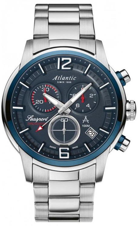 Atlantic Seasport Watch 87466.47.55 . Sportovní hodinky s chronografem (stopkami) pro aktivní muže. Klasická forma pouzdra, plynule spojená s náramkem, vytváří soudržnou a extrémně odolnou strukturu. Hodinové indexy byly vyrobeny poutavým způsobem a vytvořily originální 3D efekt. Ručičky a všechny hodinové značky jsou vyplněny luminiscenční látkou, která umožňuje odečítat čas v naprosté tmě. Pevný a pevný náramek zajišťuje pohodlí a plnou svobodu i v extrémních podmínkách a safírové sklo odolné proti poškrábání bude tento model zářit novotou i po mnoha letech.