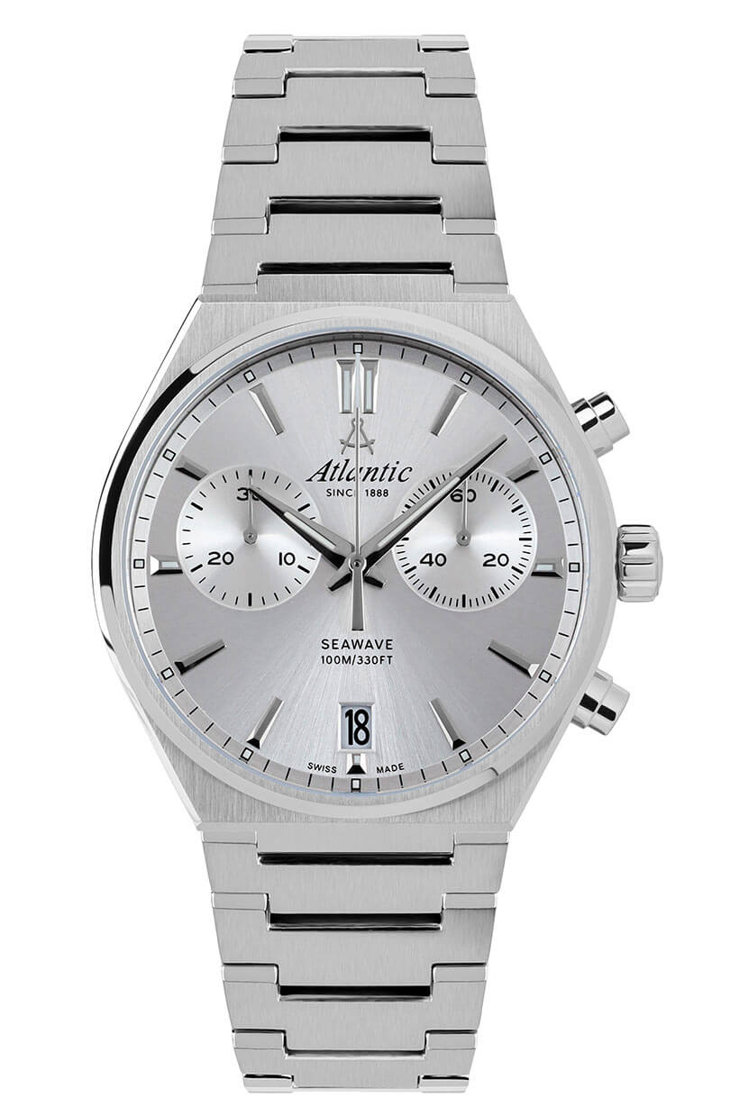 Švýcarské hodinky Atlantic Seawave Chronograph 584664121 oslní precizností a elegancí, přičemž zepředu jsou chráněny safírovým sklem odolným proti poškrábání, které zajišťuje trvanlivost a výbornou čitelnost. Stříbrný ciferník vyzařuje hloubku, zatímco ostré ručičky a výrazné indexy pokryté luminiscenční vrstvou zaručují snadné odečítání času i při slabém osvětlení. Na třetí a deváté hodině jsou umístěny subciferníky pro funkce chronografu, které umožňují přesné měření kratších časových úseků — ideální pro milovníky aktivit. Logo Atlantic s ikonickým symbolem lodního kružítka hrdě dominuje na dvanácté hodině, přidávajíc hodinkám prestižní charakter. Na šesté hodině je praktický datový ukazatel s tmavým podkladem, který nenápadně zobrazuje den v měsíci, čímž zvyšuje funkčnost hodinek. Pod krásným povrchem ciferníku se ukrývá spolehlivý švýcarský strojek Ronda, známý svou přesností a spolehlivostí, což činí tento časoměr ideálním společníkem pro každodenní výzvy.