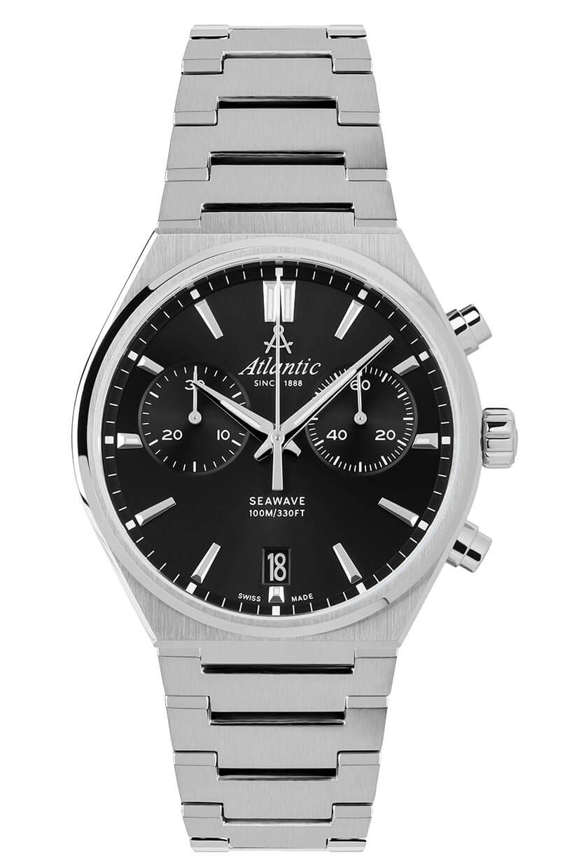 Švýcarské hodinky Atlantic Seawave Chronograph 584664161 oslní precizností a elegancí, přičemž zepředu jsou chráněny safírovým sklem odolným proti poškrábání, které zajišťuje trvanlivost a výbornou čitelnost. Černý ciferník vyzařuje hloubku, zatímco ostré ručičky a výrazné indexy pokryté luminiscenční vrstvou zaručují snadné odečítání času i při slabém osvětlení. Na třetí a deváté hodině jsou umístěny subciferníky pro funkce chronografu, které umožňují přesné měření kratších časových úseků — ideální pro milovníky aktivit. Logo Atlantic s ikonickým symbolem lodního kružítka hrdě dominuje na dvanácté hodině, přidávajíc hodinkám prestižní charakter. Na šesté hodině je praktický datový ukazatel s tmavým podkladem, který nenápadně zobrazuje den v měsíci, čímž zvyšuje funkčnost hodinek. Pod krásným povrchem ciferníku se ukrývá spolehlivý švýcarský strojek Ronda, známý svou přesností a spolehlivostí, což činí tento časoměr ideálním společníkem pro každodenní výzvy.