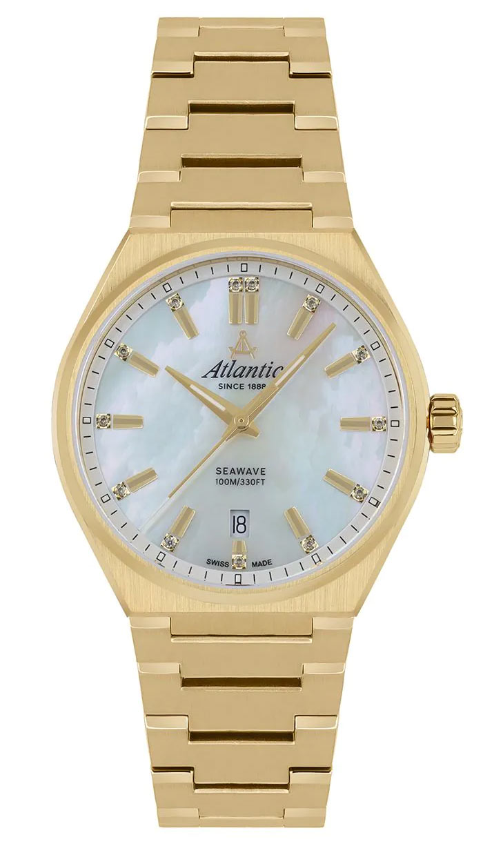 Perleťový ciferník zaujme svou přirozenou strukturou a světelným efektem, který se mění podle úhlu dopadu světla. Indexy jsou ozdobeny třpytivými krystaly, které kompozici dodávají výraznost a šperkový charakter. Uvnitř pracuje precizní švýcarský quartzový strojek Ronda – spolehlivý, diskrétní a bezúdržbový. Pozlacené dámské hodinky Atlantic Seawave Lady 39365.45.01 na náramku jsou časoměřičem, který spojuje praktičnost s estetikou – stvořený pro sebevědomé ženy, které vědí, jak být elegantní za všech okolností.