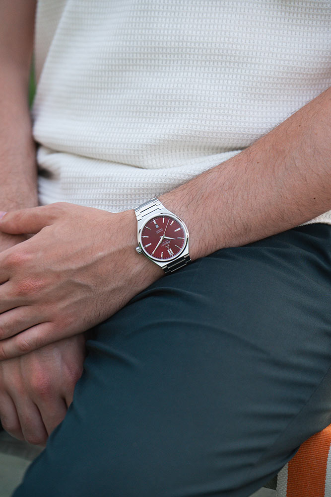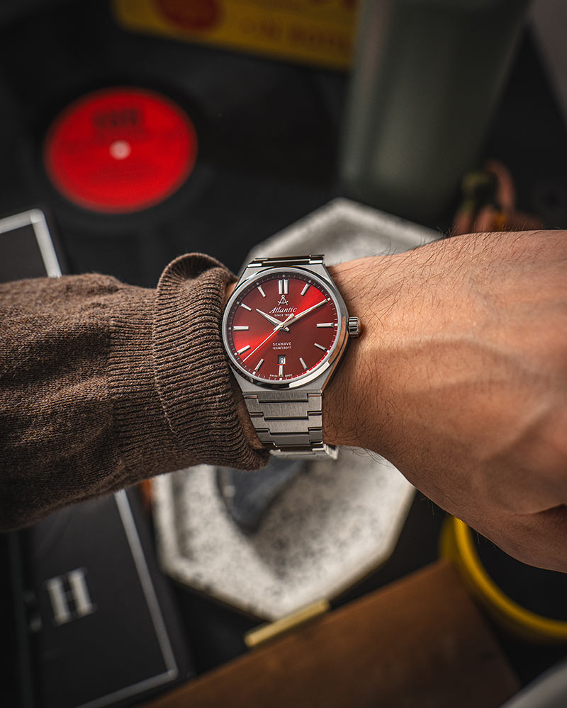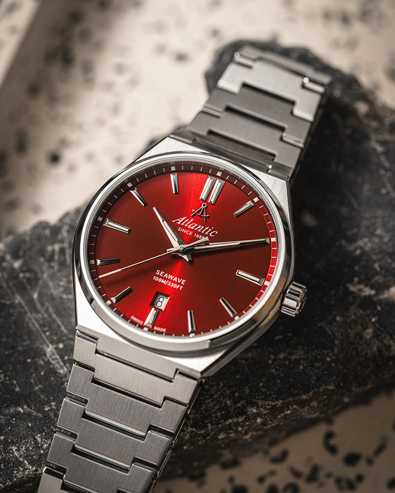 Na přední straně je safírové sklo odolné proti poškrábání. Kryje minimalistický červený ciferník s ostrými ručičkami a velkými indexy s luminiscenční hmotou, která usnadňuje odečítání času ve tmě. Pozici 12 hodin zdobí hrdé logo značky Atlantic s rozpoznatelným znakem v podobě kompasu lodního navigátora. Funkce hodinek Atlantic doplňuje zobrazení data na 6. hodině. Okno se světlým pozadím zobrazuje aktuální den v měsíci. Pod lesklým povrchem číselníku je instalován švýcarský mechanismus Ronda, který zaručuje přesné měření času nezbytné pro dnešní dynamický životní styl. Náramkové hodinky Atlantic budou perfektním doplňkem každého pánského šatníku.