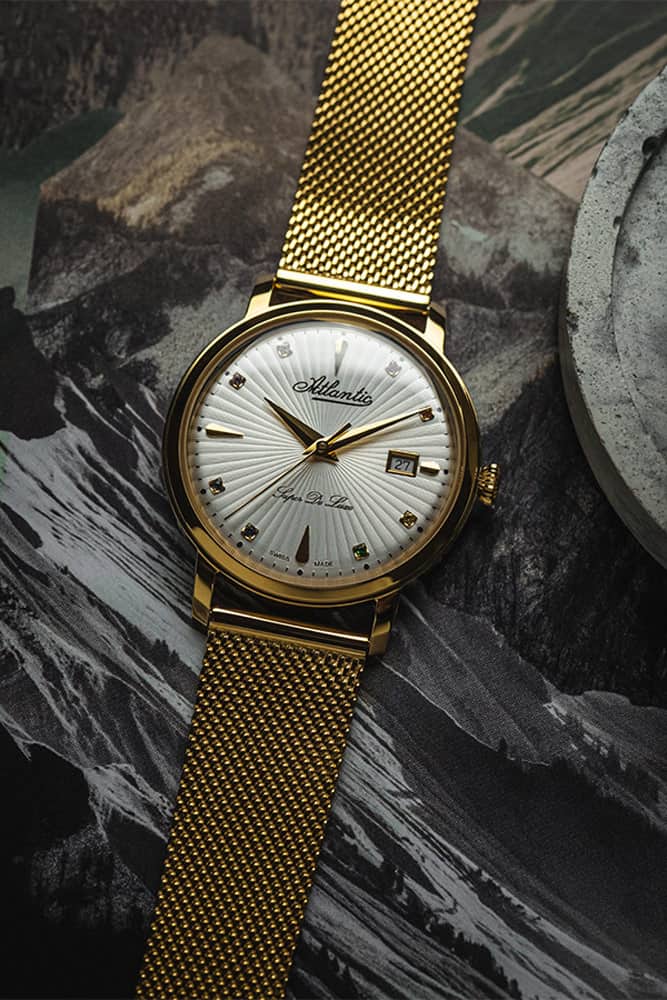 Pozlacené dámské hodinky Atlantic Super De Luxe Precious Stones jsou speciálním doplňkem kolekce Super De Luxe, která se vyznačuje modely s originálním vzorovým číselníkem a safírovými kameny nahrazujícími klasické indexy. Model Atlantic 29355.45.29MB představuje zcela novou variantu v této rodině, která nabízí barevné safíry . Zlaté hodinky Atlantic s barevnými kameny na ciferníku jsou luxusním doplňkem pro ženy, které oceňují mimořádnou kvalitu a originální, zvučný styl, to vše za dostupnou cenu. Krásný ciferník hodinek Atlantic Precious Stones je chráněn safírovým sklem vysoce odolným proti poškrábání. Elegantní a ergonomický milánský náramek, stejně jako 36mm , velmi subtilní a lesklé pouzdro jsou vyrobeny z nerezové oceli potažené PVD povlakem ze žlutého zlata.