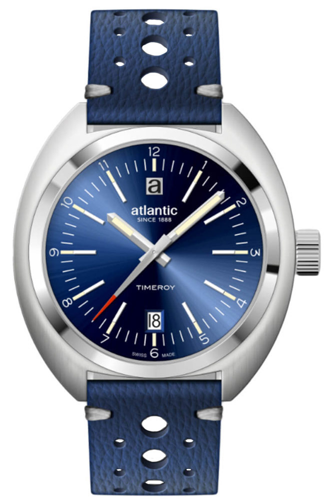 Atlantic Timeroy 703624159 má obálku typu želva známou a ceněnou pro svůj masivní vzhled a zároveň pohodlí při nošení. Jeho průměr 42 milimetrů, ukázaný v 70. letech, se ukázal být natolik univerzální, že se tvůrci rozhodli tuto velikost pouzdra znovu použít v obnoveném modelu. Jsou vyrobeny z nerezové oceli a povrchově upraveny broušeným povrchem, přičemž zajímavým prvkem je vysoce leštěná diagonální luneta, jejíž horní a spodní část sjednocuje s pouzdrem a dodává hodinkám na eleganci. Očka pouzdra jsou integrována s koženým páskem se zvětšenými otvory ve stylu rally v modré barvě.