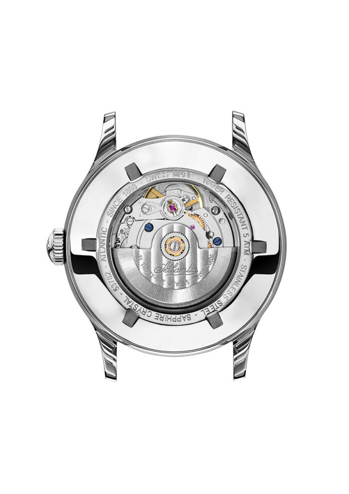 Na přední straně hodinek je průhledné safírové sklíčko, které je extrémně těžké poškrábat. Kryje šedý ciferník se štíhlými ručičkami a arabskými indexy. Ciferník byl obohacen o již dříve zmíněný subciferník rezervy chodu na šesté hodině a malý vteřinový ciferník na deváté hodině. Ve 3 hodiny je malé datumové okénko. Označuje aktuální den v měsíci. Design ciferníku je čitelný a elegantní. Umožní vám to odečíst čas téměř okamžitě na první pohled. Značka Atlantic umožňuje snadné odečítání aktuálního času i za zhoršených světelných podmínek. Na ručičky a indexy je umístěna speciální svítivá luminiscence.