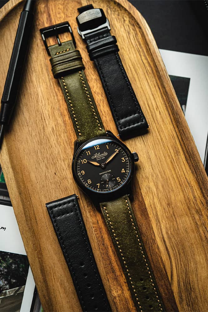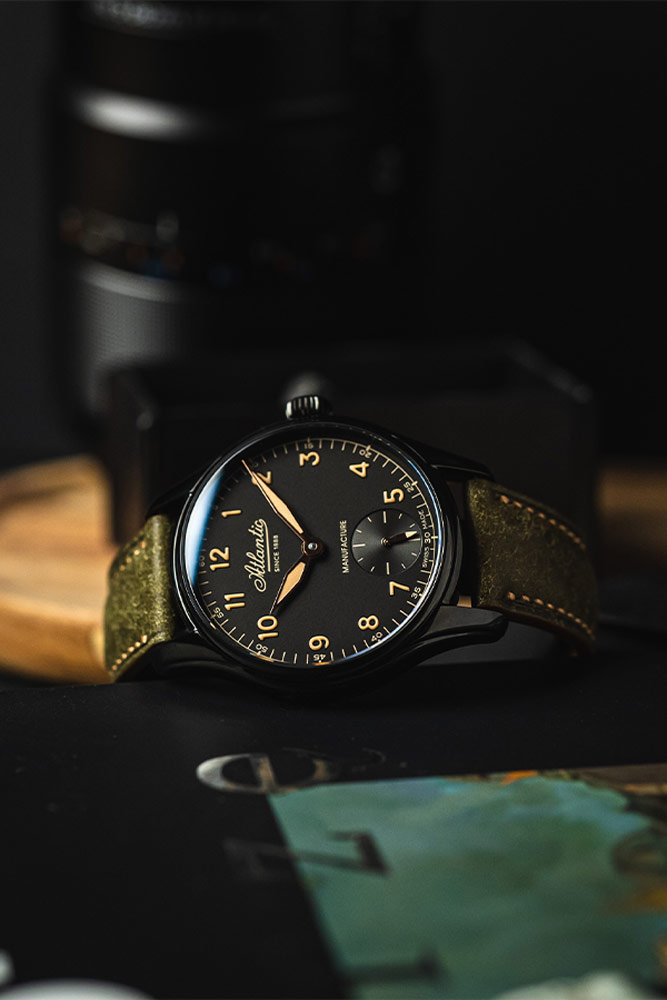 Originální, tradiční design ciferníku obohacuje každý model o nadčasový charakter a použití moderní technologie zvýraznění typografie a ruček (Super-LumiNova® v klimatickém odstínu béžové) a konvexního safírového skla s antireflexní vrstvou dodává je to opravdová síla. V tandemu s matným pouzdrem o tloušťce 11,9 mm , na které straně najdeme limitní číslo označené jako xxx/188 objeví se hladký, černý vysoce kvalitní kožený řemínek s motýlkovou sponou . V případě této nabídky navíc výrobce poskytuje ručně šitý italský kožený řemínek s přezkou, který díky své zelené barvě a charakteristické textuře dokonale podtrhuje jedinečný styl časomíry.