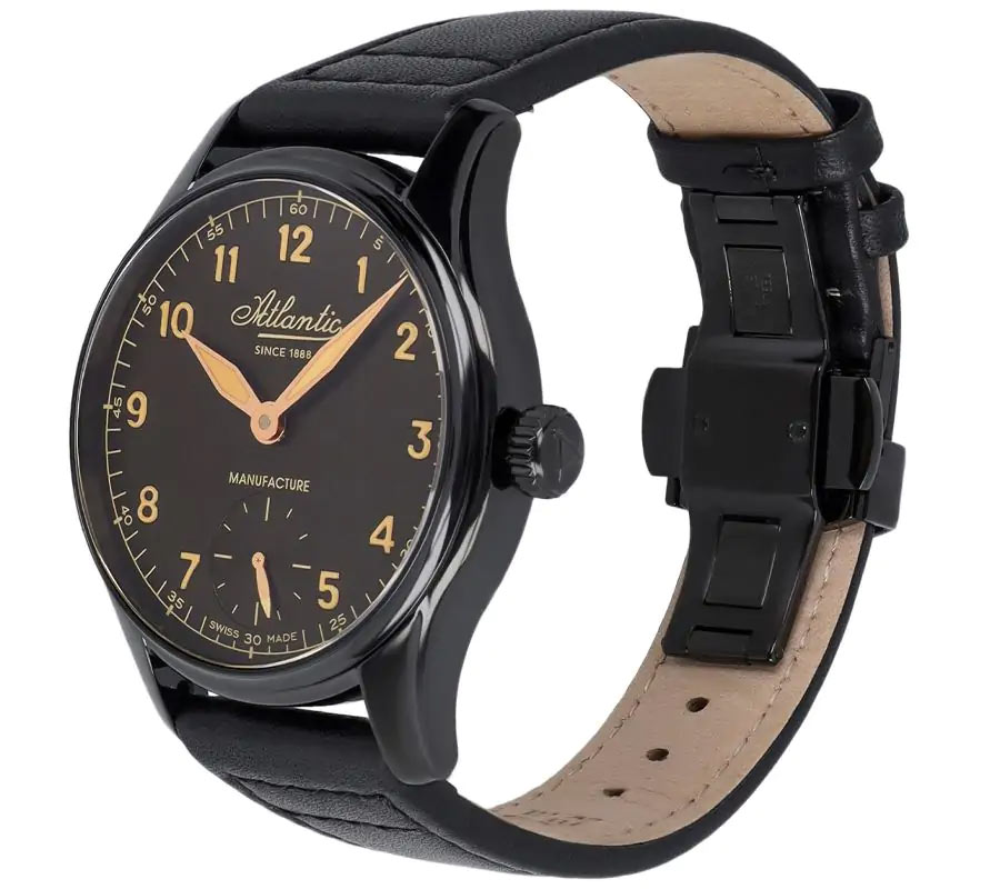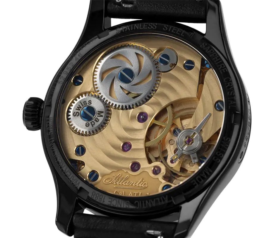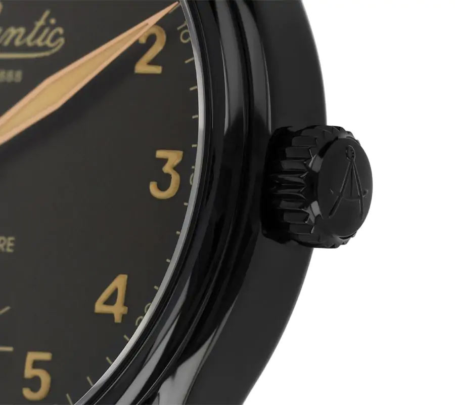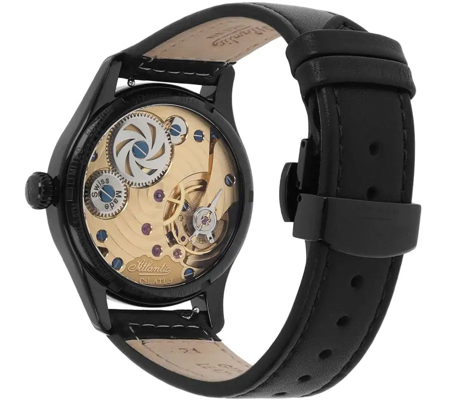Vlastní limitované hodinky Atlantic 52952.46.63R jsou umístěny v odolném černém PVD pouzdru z nerezové oceli s optimálním průměrem 42 mm . Jeho rub je prosklený, což umožňuje jeho nositeli neustále fascinovat pohledem na „živou“, švýcarskou mechaniku, která je nejnovějším mistrovským dílem atlantické hodinářské výroby in-house. Výše uvedená verze pánských mechanických hodinek Atlantic z nové řady Worldmaster Manufacture Mechanical představuje tmavé barevné schéma doplněné letitou barvou luminiscenčních indexů a indikací.
