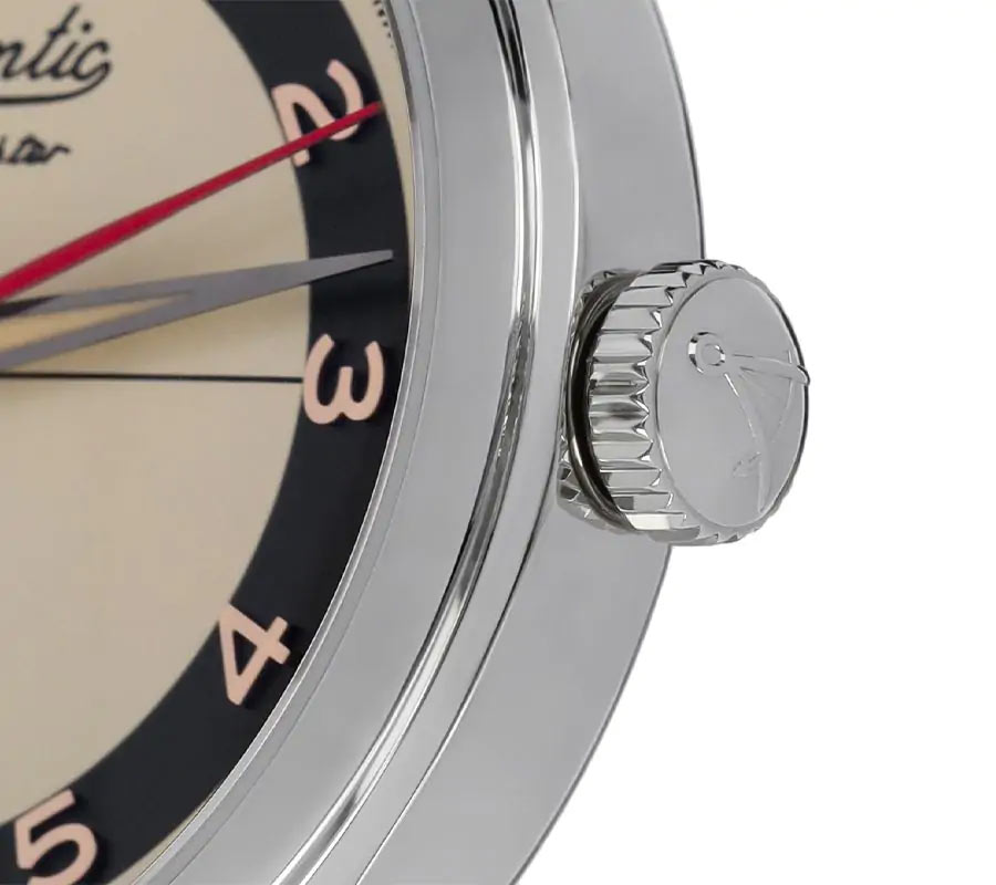 Samotné pouzdro spolu s ciferníkem inspirovaným kompasem byly navrženy s důrazem na jemné, ale pro uživatele mechanických hodinek důležité detaily. 12 arabských číslic spočívá na výrazném modrém lemu. Ručičky hodin a minut jsou obklopeny černou čitelnou konturou a pokryty luminiscenční látkou, která svítí ve tmě. Červená vteřinovka v opozici k béžovému ciferníku je nepřehlédnutelná. Kroužek s 60minutovou stupnicí nad hodinami skvěle doplňuje sadu časových informací. Sférické safírové sklíčko vysoce odolné proti poškrábání je v tomto případě završením uceleného celku udržovaného v jedinečném stylu.