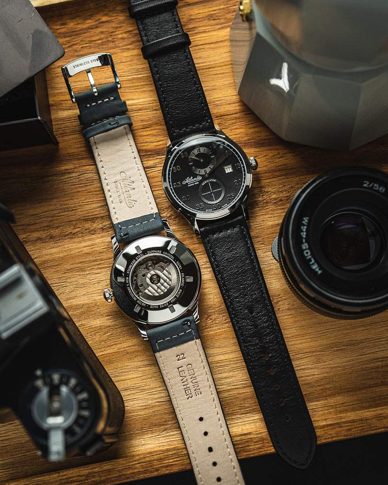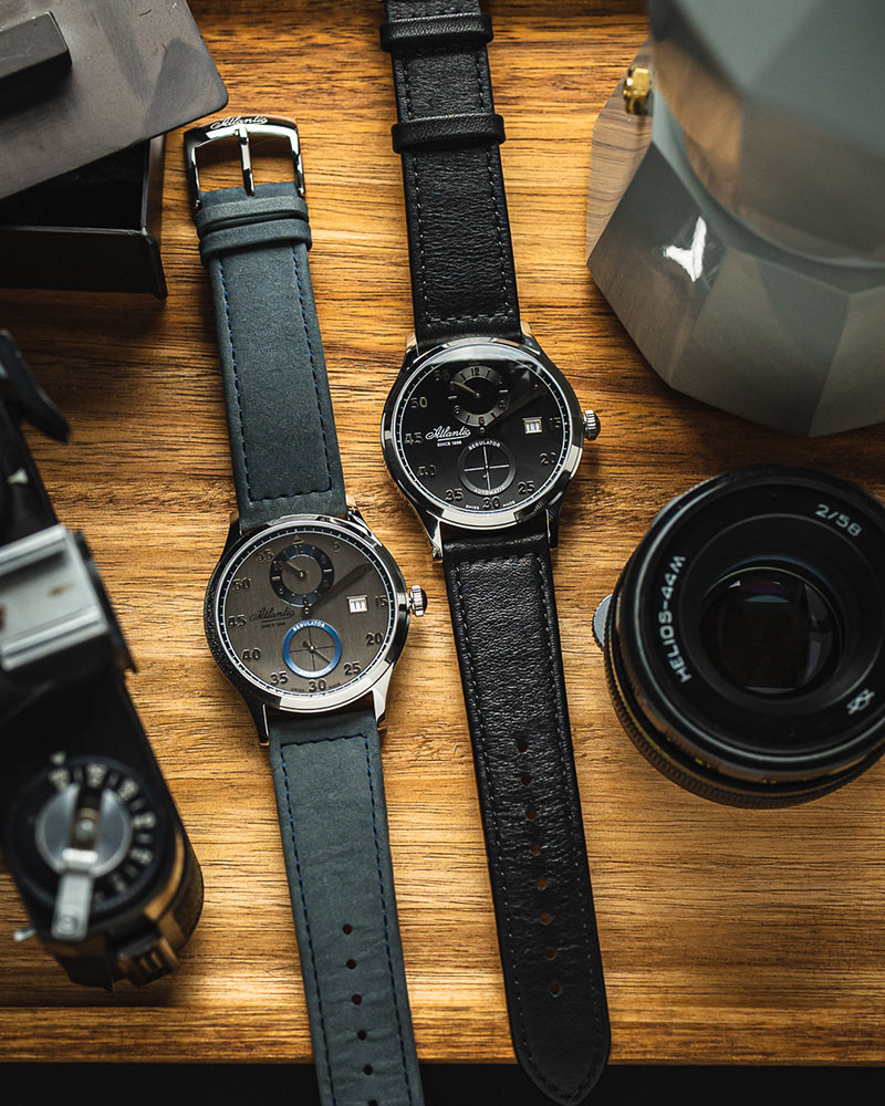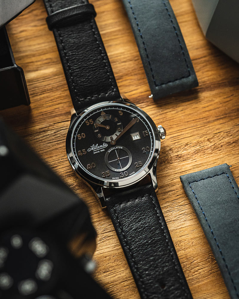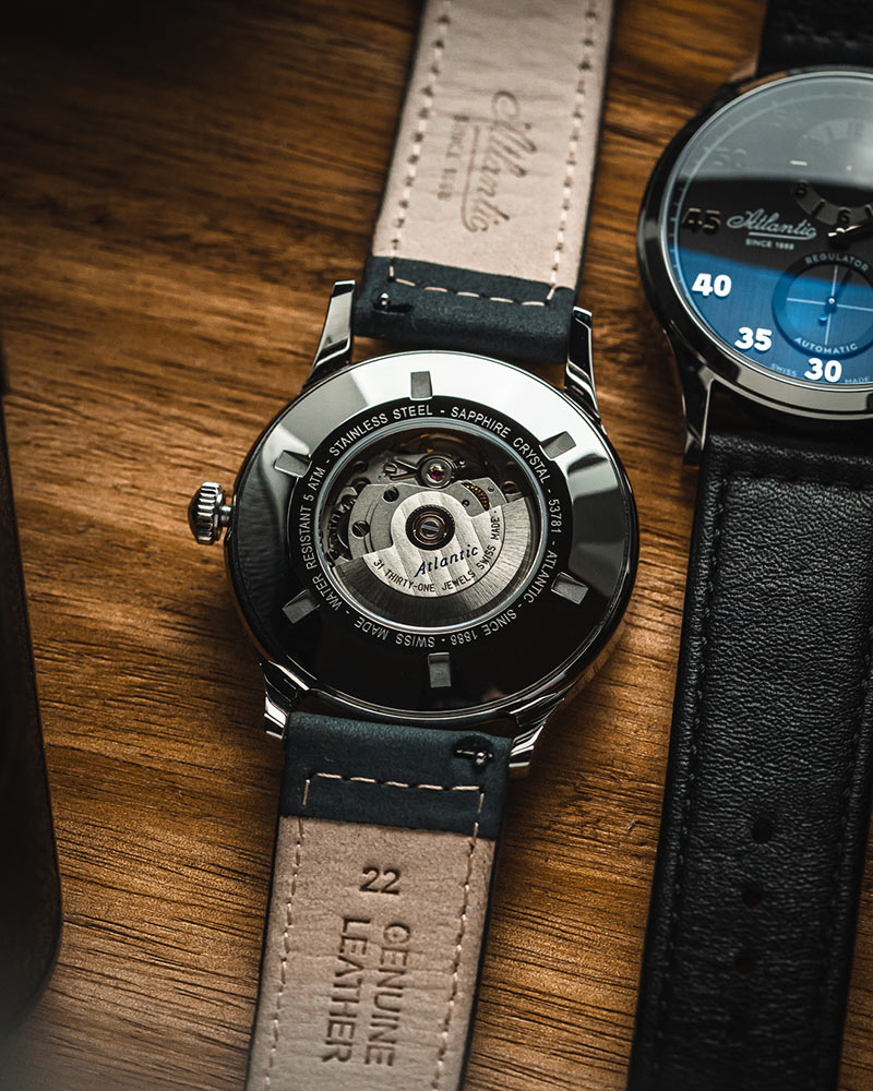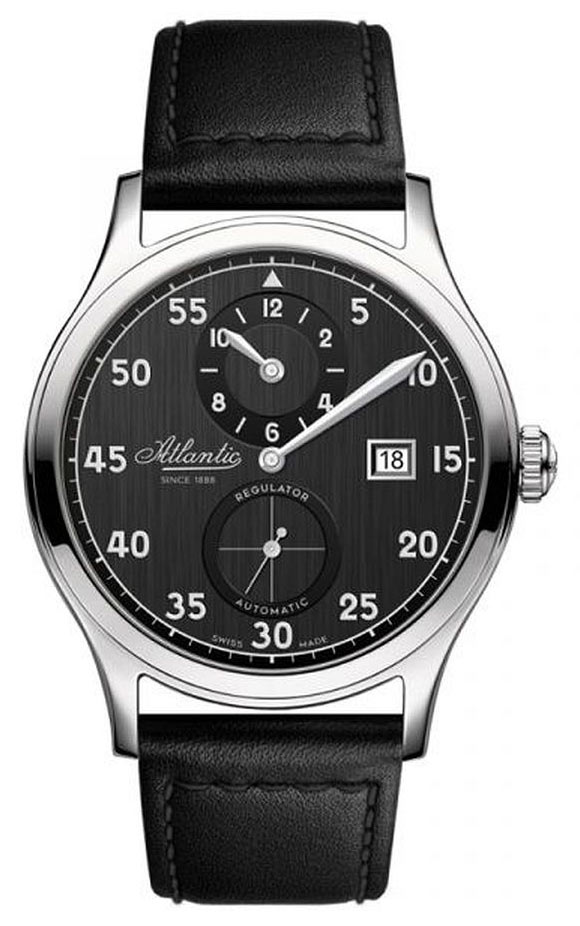 Pánské Atlantic Worldmaster Regulator Automatic 53781.41.63 je 42mm kulaté pouzdro vyrobené z nerezové oceli ve stříbrné barvě. Na zadní straně pouzdra je šroubovací víko s okénkem, díky kterému můžeme obdivovat práci mechanismu. Na očka pouzdra je připevněn elegantní černý kožený řemínek. Sada obsahuje také přídavný pásek, který umožňuje přizpůsobit barvu hodinek vašim potřebám. Pod tvrdým a těžko poškrábatelným safírovým sklíčkem se nachází černý ciferník, na kterém jsou velmi zajímavě naznačeny hodiny. Atlantic Worldmaster Regulator má typ ciferníku, na kterém minutová ručička přitahuje největší pozornost. Na číselníku jsou dva subciferníky. Ve 12 hodin ukazuje malá ručička subciferníku aktuální čas. Na spodní straně číselníku je sekundový subciferník. Uprostřed je velká a čitelná minutová ručička. Koncept takové časomíry spočívá především ve sledování ubíhajících minut.