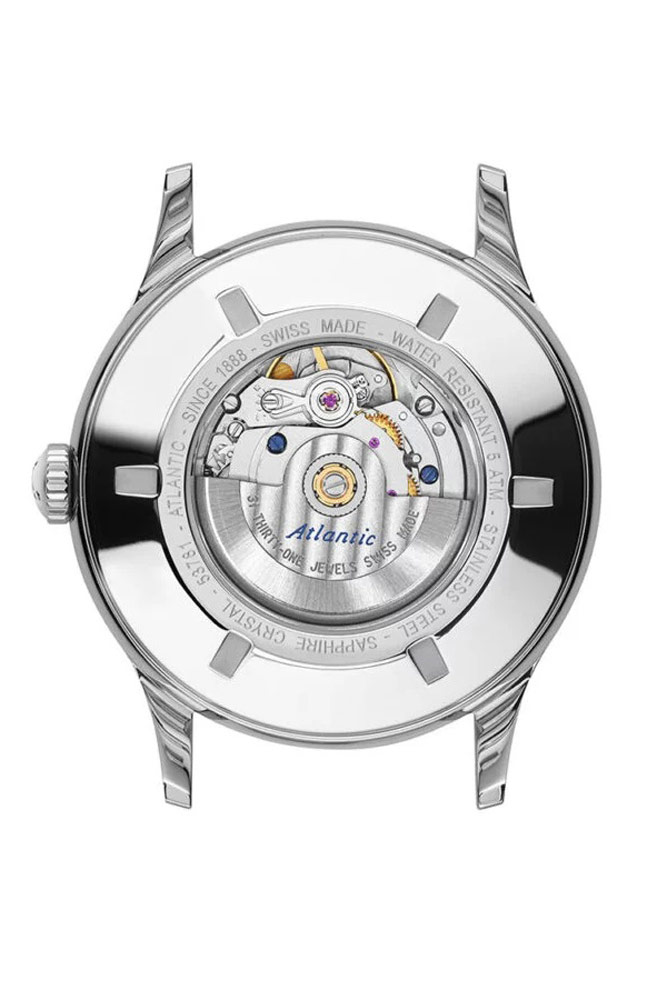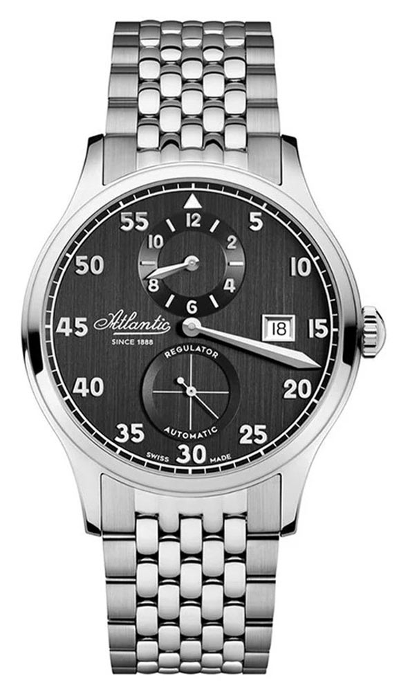 Pánské hodinky Atlantic Worldmaster Regulator Automatic 53786.41.63 jsou 42mm kulaté pouzdro vyrobené z nerezové oceli ve stříbrné barvě. Na zadní straně pouzdra je šroubovací víko s okénkem, díky kterému můžeme obdivovat práci mechanismu. Ocelový náramek stříbrné barvy je připevněn k výstupkům pouzdra. Pod tvrdým a těžko poškrábatelným safírovým sklíčkem se nachází antracitový ciferník, na kterém jsou velmi zajímavě naznačeny hodiny. Atlantic Worldmaster Regulator má typ ciferníku, na kterém minutová ručička přitahuje největší pozornost. Na číselníku jsou dva subciferníky. Ve 12 hodin ukazuje malá ručička subciferníku aktuální čas. Na spodní straně číselníku je sekundový subciferník. Uprostřed je velká a čitelná minutová ručička. Koncept takové časomíry spočívá především ve sledování ubíhajících minut.