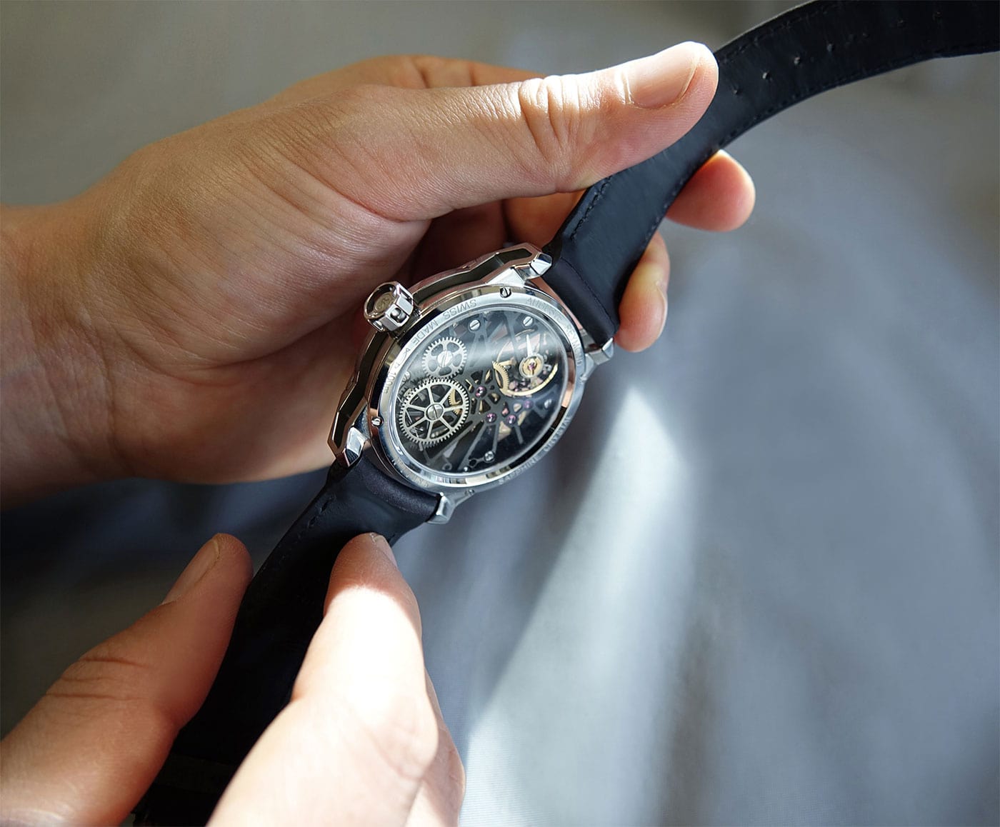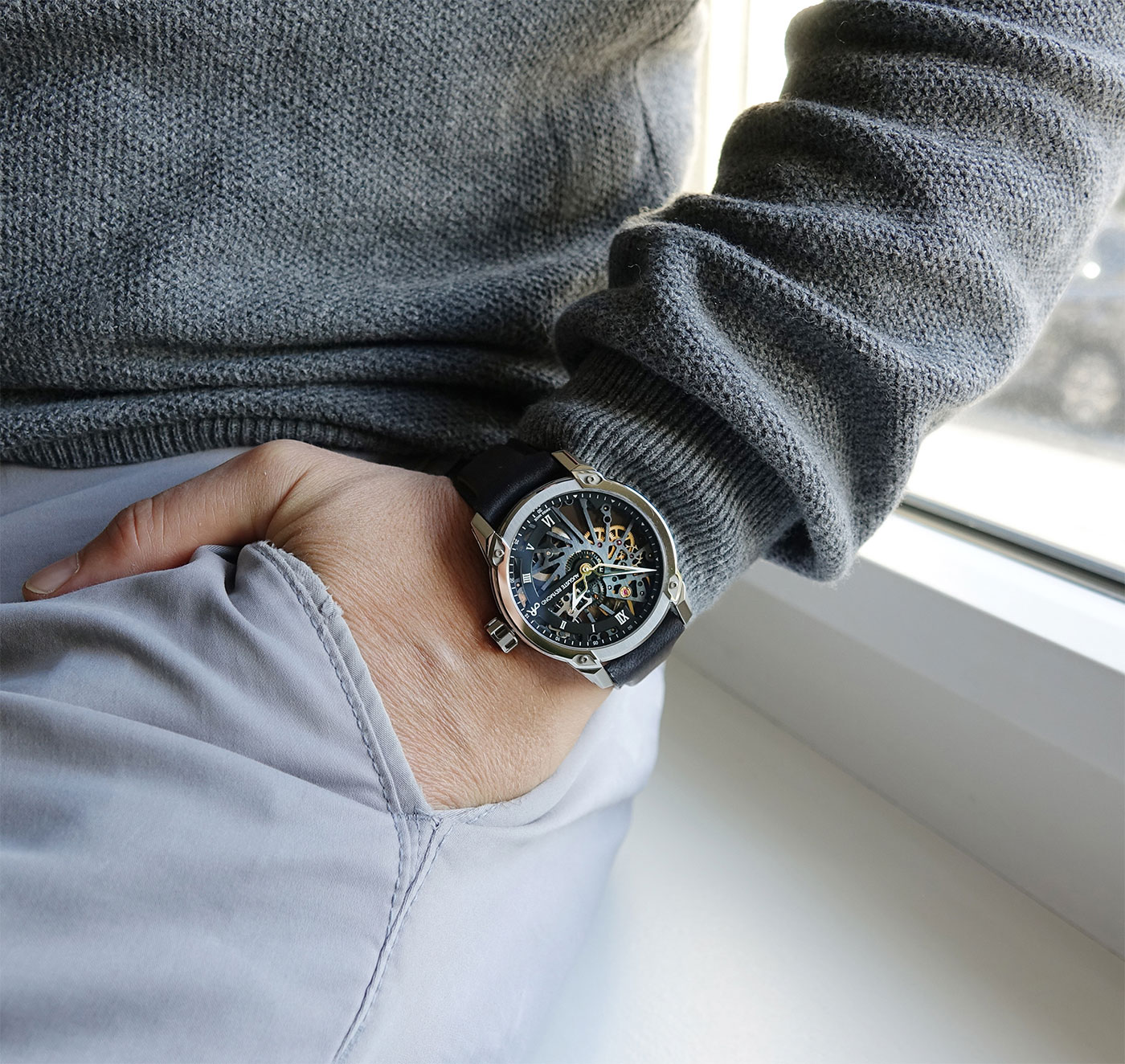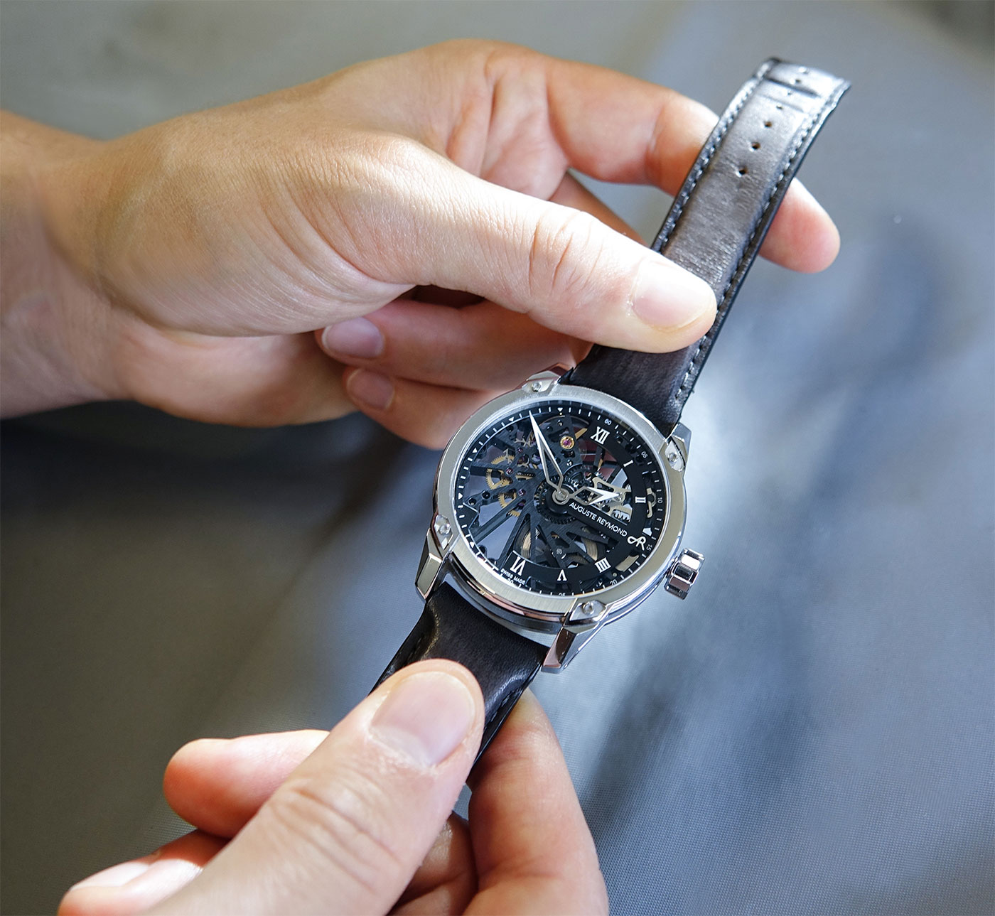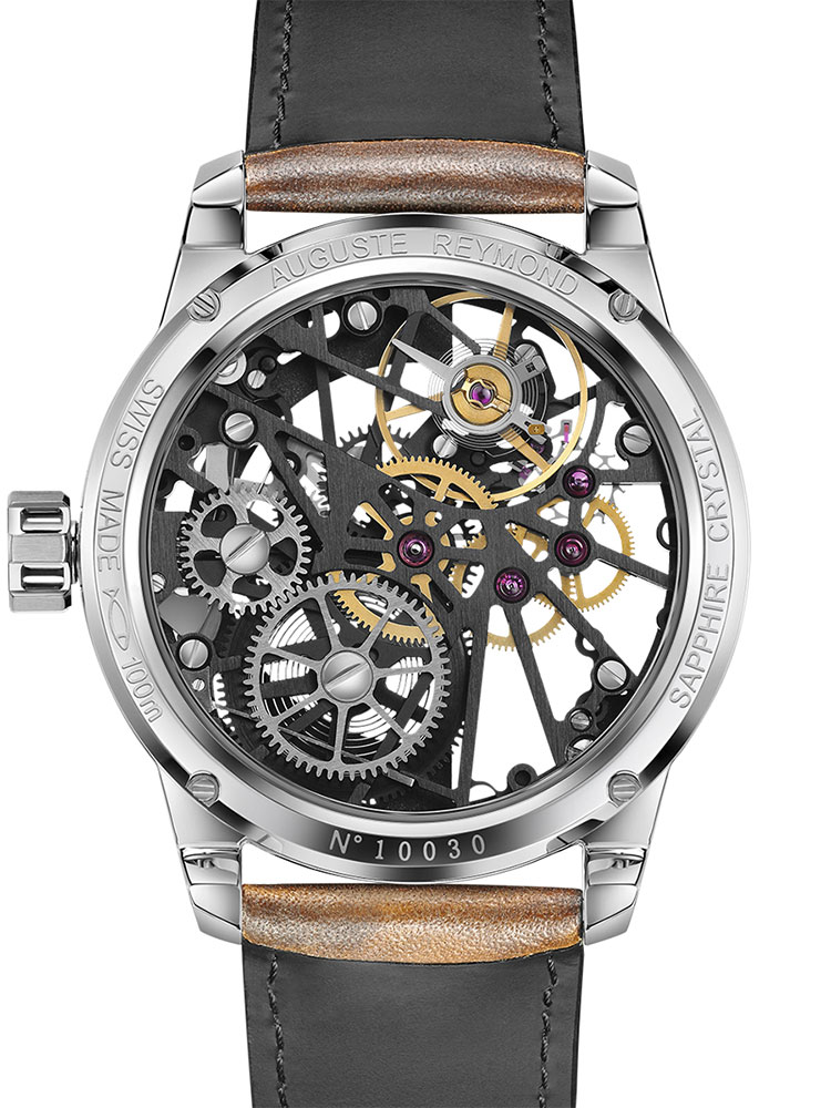 Opravdové řemeslné zpracování těchto neobvyklých hodinek můžete vidět, když je otočíte naruby. Celý mechanismus byl skeletonizován, díky čemuž poskytuje opravdu mimořádný výhled a umožňuje nahlédnout do dokonalosti a třídy mechanického hodinářství. Prolamovaná korunka a 44milimetrové pouzdro mají moderní linie inspirované posvátnou geometrií. To v kombinaci s nejvyšší kvalitou nerezové oceli a perfektní povrchovou úpravou poskytuje nový organoleptický zážitek. Vodotěsnost hodinek je 100 metrů , takže je lze bez obav používat každý den. Dalším vizuálním lákadlem a originálním prvkem je lesklý kroužek přišroubovaný 4 šrouby. Jak ono, tak i další prvky – šroubovací pouzdro, pouzdro zajištěné skeletovým obalem s prolamovanými rohy a středem – se skládají ze čtyř samostatných, ale těsně spojených částí. Bijícím srdcem Auguste Reymond Origin Unitas Skeleton je spolehlivý a ručně natahovaný Machineek Unitas s rezervou chodu 44 hodin . Jde o celosvětově uznávané hnutí, které v minulosti přispělo k pověsti značky Auguste Reymond. Hodinky jsou k dispozici na koženém řemínku s patentovaným zapínáním na patentku.