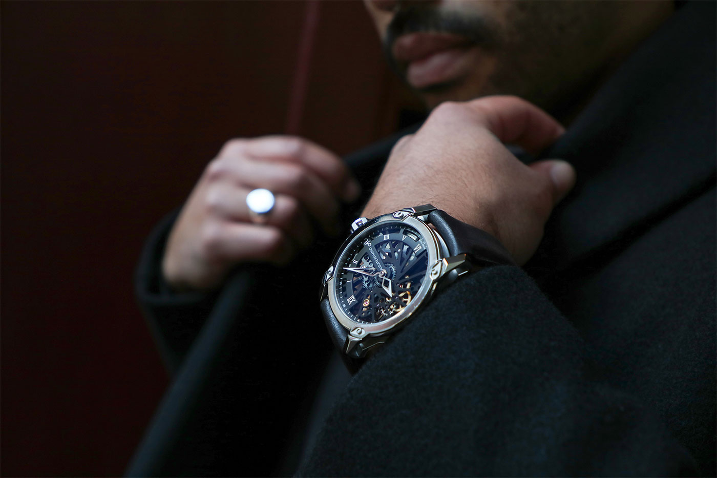 Transparentní a fascinující hodinky Auguste Reymond Origin Unitas Skeleton jsou filozofií každodenního rituálu: ruční natahování hodinek. Krása Machineku spojená s tím, co je v hodinářství zásadní – přesnost a spolehlivost. Hodinky se ponoří do světa astronomie a matematiky, dvou oborů, ze kterých hodinářství pochází. Model AR.OR.14H.001.901.301 je mimořádně zajímavý díky neobvyklému ciferníku s vytříbenou architekturou, který je v něm použit (jemný odkaz na astrolaby - měřicí příMachinee, které po staletí provázejí průzkum času a prostoru.). Půvab dodávají ručky s charakteristickým a inovativním tvarem (připomínajícím kompas), jejichž okraje jsou pokryty luminiscenční hmotou, která září zeleně. Zobrazovací systém je chráněn safírovým sklem s antireflexní vrstvou na obou stranách.