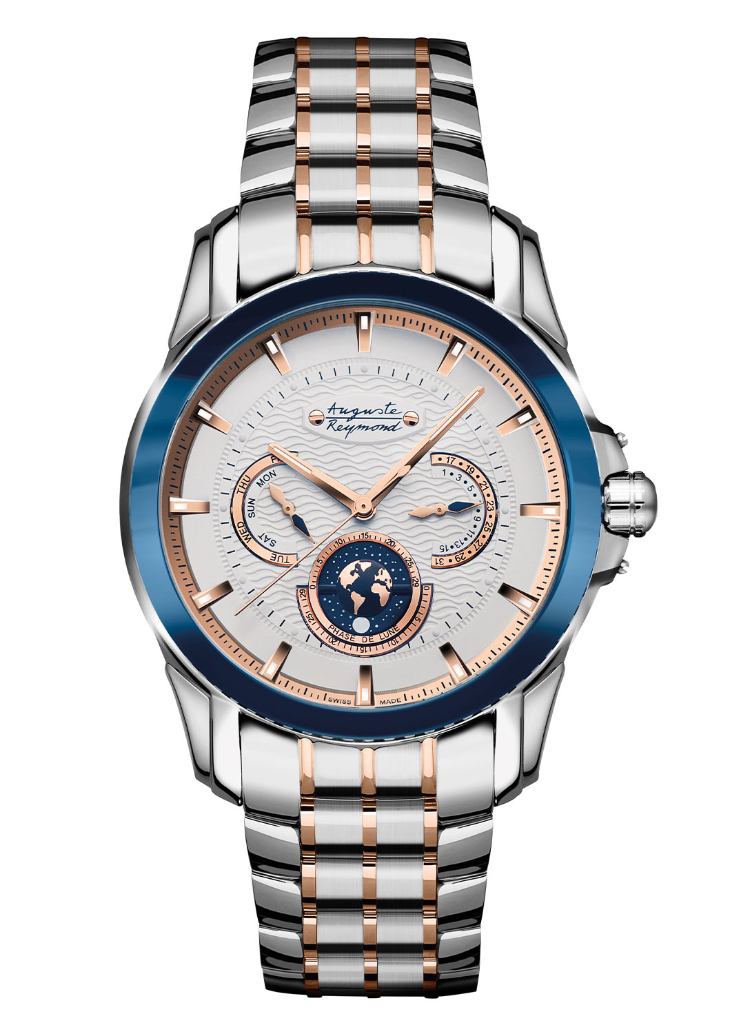 Bílý ciferník Auguste Reymond Tramelan Magellan Orbital Moon je zdoben rafinovanými gilošovými vlnami, které mu dodávají jemnou eleganci a sofistikovanost. V pouzdře tohoto unikátního modelu je umístěn přesný švýcarský strojek s podmanivou komplikací orbitální fáze Měsíce, s rotujícím diskem zobrazujícím fascinující cestu Měsíce kolem Země, zachycující ducha neomezeného průzkumu vesmíru. Řada MAGELLAN klade důraz na silný, a přesto mužný design, je dokonalým společníkem na neobyčejné životní cesty. Na oslavu 125. výročí značky bylo na číselníku zachováno původní logo AUGUSTE REYMOND, které toto zvláštní výročí zdůrazňuje. Celek je završen antireflexním safírovým sklem, které je odolné proti poškrábání a zajišťuje tak hodinkám odolnost a nadčasovou krásu.
