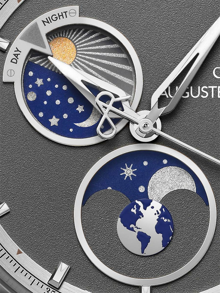 Kromě inovativního designu hraje důležitou roli standard dokončovacích detailů. Design prolamované krajky odkazuje na hodinová kolečka a historické měřicí příMachinee. Tento detail dodává designu exteriéru automatických hodinek s fází měsíce mechanický nádech. Mezi složité funkce patří kartáčované povrchy na korunových řezech a pískované prohlubně. Pískovaný ciferník má uprostřed logo značky. Disky řady Auguste Reymond Day and Night jsou navrženy tak, aby rozlišovaly denní dobu. Tvar indikací by měl připomínat šipky kompasu. Výrazným akcentem je v jejich případě Super-LumiNova® - luminiscenční látka. Protiváhu sekundové ručičky zatraktivňuje až prolamovaná verze loga značky. Díky specifičnosti svého designu a v závislosti na poloze sekundová ručička zobrazuje logo nebo symbol nekonečna. Funkce fází měsíce zahrnuje kruh představující Zemi je symbolickým znázorněním oběžné dráhy Měsíce kolem naší planety. Model Unity je vybaven automatickým mechanickým Machinekem s rezervou chodu 42 hodin , vyznačuje se modrým oscilačním závažím potaženým PVD.