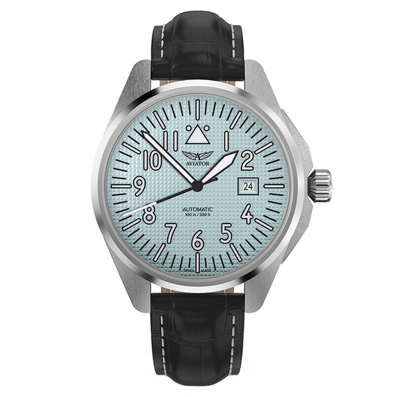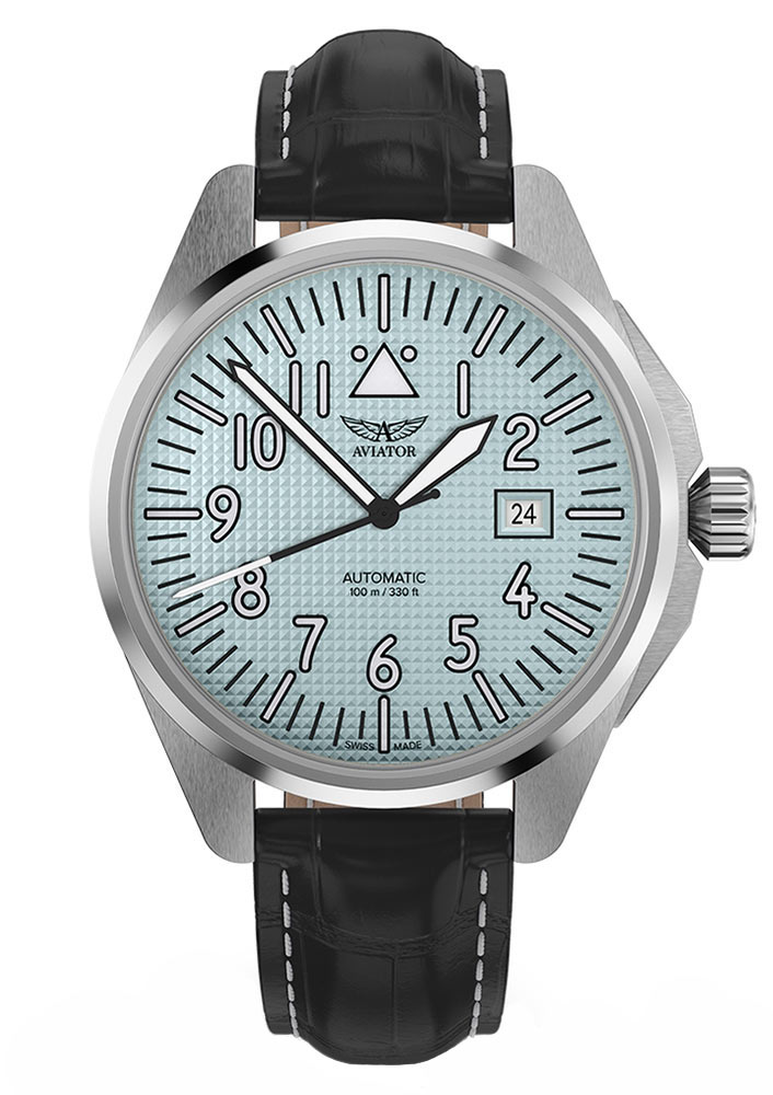 Tyto hodinky inspirované duchem klasických leteckých hodinek zaujmou minimalistickým světle modrým ciferníkem, jehož jedinečná trojrozměrná textura jim dodává jedinečný charakter. Široké aplikované rejstříky nejen zdůrazňují estetiku, ale také zajišťují vynikající čitelnost i v těch nejtěžších podmínkách. Aktuální čas ukazují velké protáhlé ručičky a den v měsíci ukazuje datumovka, jejíž okénko je umístěno na třetí hodině. Výrobce si dal záležet na tom, aby údaje z ciferníku byly dobře čitelné i za horšího osvětlení. Na ručičky a indexy se aplikuje Swiss Super-LumiNova® luminiscence. Celý ciferník je krytý safírovým sklem odolným proti poškrábání s antireflexní vrstvou, která odráží světlo.
