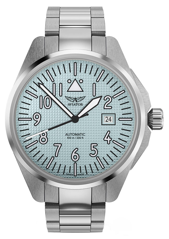 Tento model, inspirovaný klasickými leteckými hodinkami, zaujme minimalistickým světle modrým ciferníkem, jehož jedinečná trojrozměrná textura mu dodává jedinečný charakter. Široké aplikované rejstříky nejen zdůrazňují estetiku, ale také zajišťují vynikající čitelnost i v náročných podmínkách. Velké, protáhlé ručičky ukazují aktuální čas, zatímco datum ve tři hodiny usnadňuje sledování data. Výrobce si dal záležet na tom, aby byly údaje na ciferníku dobře čitelné i při slabém osvětlení, a to díky použití švýcarské luminiscence Super-LumiNova® na ručičkách a indexech. Celé to chrání ciferník se safírovým sklem odolným proti poškrábání s antireflexní vrstvou, která eliminuje odrazy světla.