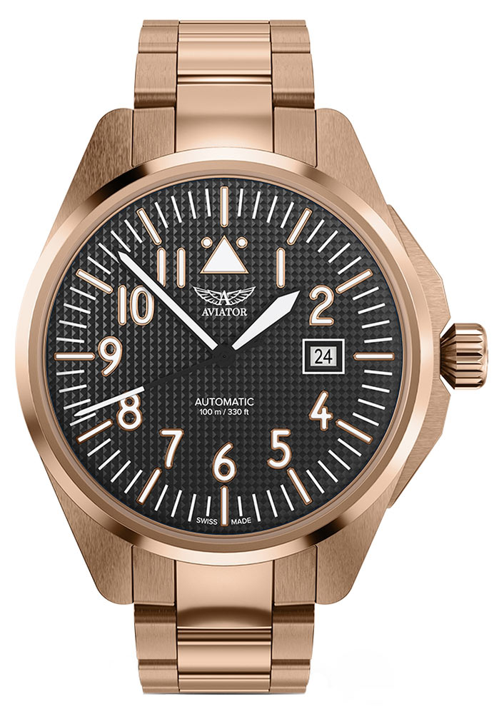 Tento model, inspirovaný klasickými leteckými hodinkami, zaujme minimalistickým černým ciferníkem, jehož jedinečná trojrozměrná textura mu dodává jedinečný charakter. Široké aplikované rejstříky nejen zdůrazňují estetiku, ale také zajišťují vynikající čitelnost i v náročných podmínkách. Velké, protáhlé ručičky ukazují aktuální čas, zatímco datum ve tři hodiny usnadňuje sledování data. Výrobce si dal záležet na tom, aby byly údaje na ciferníku dobře čitelné i při slabém osvětlení, a to díky použití švýcarské luminiscence Super-LumiNova® na ručičkách a indexech. Celé to chrání ciferník se safírovým sklem odolným proti poškrábání s antireflexní vrstvou, která eliminuje odrazy světla.