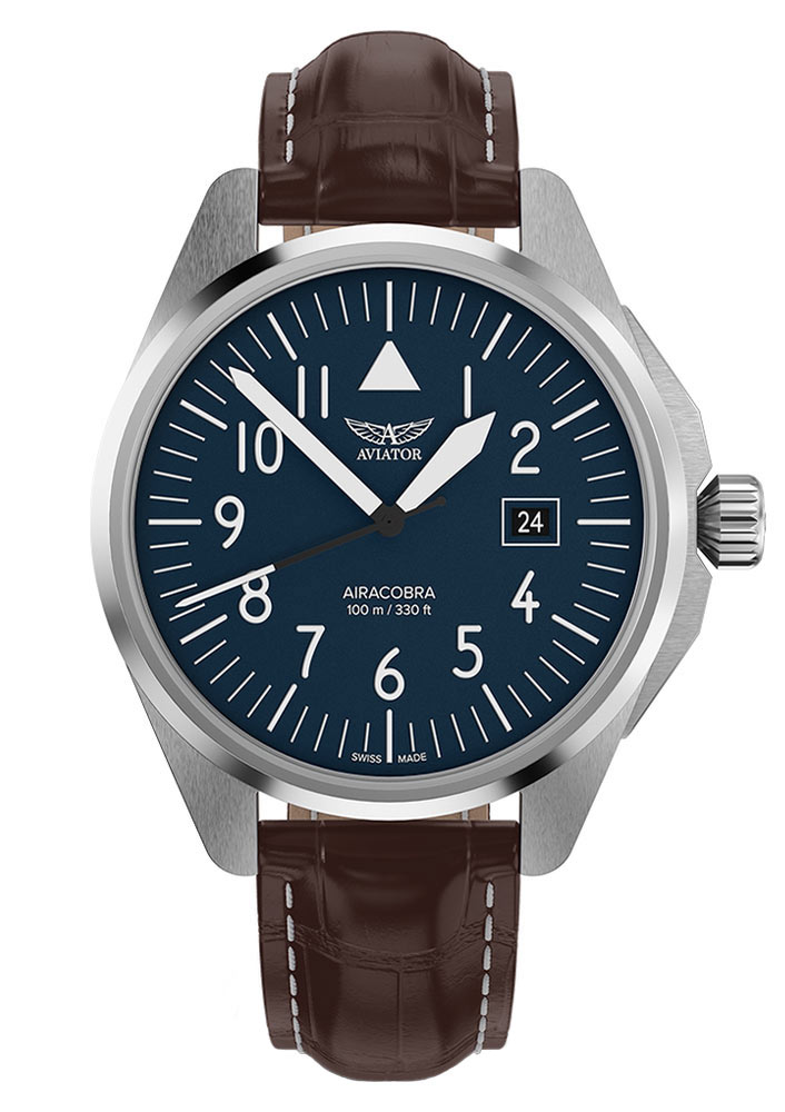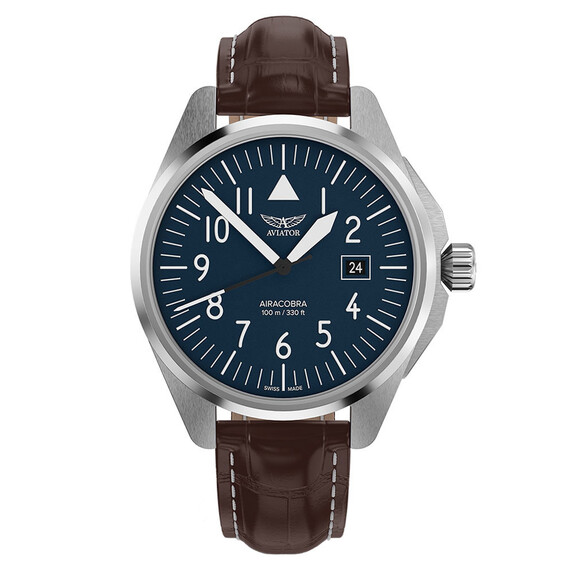 Hodinky Aviator Airacobra 43 Type A V.1.38.0.317.4 na hnědém koženém řemínku se vyznačují nejen elegancí, ale také spolehlivostí a přesností, které jsou nedílnou součástí každého modelu Aviator. Pevné 42.80mm pouzdro z nerezové oceli v klasické stříbrné barvě zajišťuje nejen estetiku, ale také odolnost a chrání vnitřek hodinek před vnějšími vlivy. Velká a ergonomická korunka na pravé straně umožňuje snadné ovládání rukou a zároveň poskytuje další prvek leteckého designu. Ocelový, šroubovací kryt uzavírající zadní stranu hodinek zaručuje voděodolnost do hloubky 100 metrů.