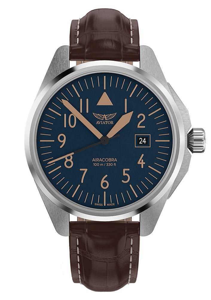 Křemenné hodinky Aviator Airacobra 43 představují minimalistický modrý ciferník v leteckém stylu. Ručičky a indexy pokryté luminiscencí Swiss Super-LumiNova® zaručují perfektní čitelnost v kteroukoli denní i noční dobu. Datumovka umístěná na třech hodinách usnadňuje sledování aktuálního data a zároveň klade důraz na funkčnost tohoto modelu. Celé to chrání safírové sklíčko odolné proti poškrábání, navíc opatřené antireflexní vrstvou, která zajišťuje čistotu čtení i za ztížených světelných podmínek.