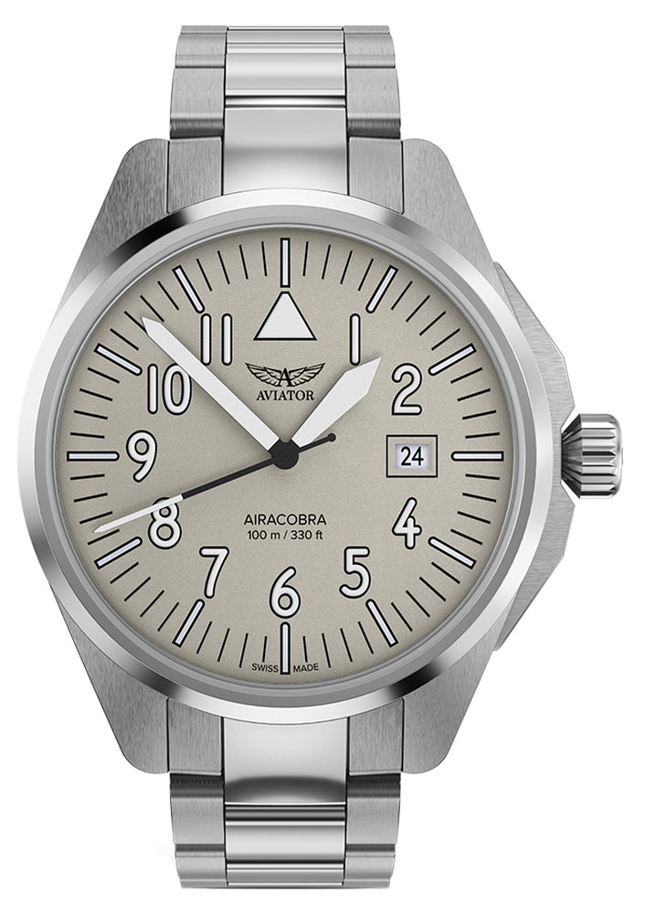 Náramkové hodinky Aviator Airacobra 43 Type A V.1.38.0.320.5 se vyznačují nejen pevnou konstrukcí, ale také spolehlivostí a precizností ovládání, kterou se vyznačuje každý model švýcarské značky Aviator. Pouzdro o průměru 42.80 mm, vyrobené z nerezové oceli, představuje elegantní odstín stříbrné, zajišťující nejen estetiku, ale také odolnost vůči vnějším faktorům. Ergonomická korunka umožňuje pohodlné nastavení času a zároveň přidává do leteckého designu výrazný prvek. Šroubovací kryt uzavírající zadní stranu hodinek zajišťuje voděodolnost do hloubky 100 metrů, což z nich dělá nenahraditelného společníka při každodenních aktivitách.