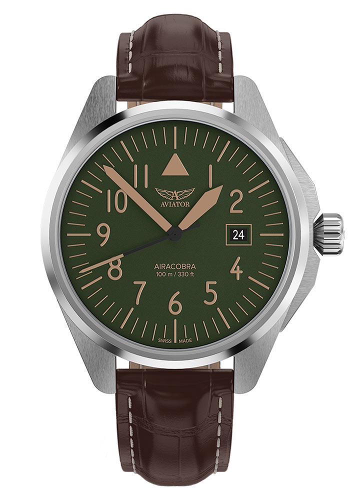Quartzové hodinky Aviator Airacobra 43 představují minimalistický zelený ciferník v leteckém stylu. Ručičky a indexy pokryté luminiscencí Swiss Super-LumiNova® zaručují perfektní čitelnost v kteroukoli denní i noční dobu. Datumovka umístěná na třech hodinách usnadňuje sledování aktuálního data a zároveň klade důraz na funkčnost tohoto modelu. Celé to chrání safírové sklíčko odolné proti poškrábání, navíc opatřené antireflexní vrstvou, která zajišťuje čistotu čtení i za ztížených světelných podmínek.