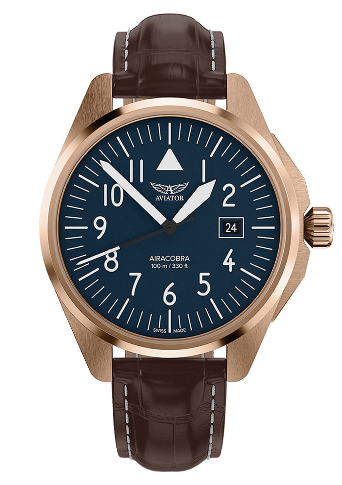 Quartzové hodinky Aviator Airacobra 43 mají modrý ciferník v leteckém stylu. Ručičky a indexy pokryté luminiscencí Swiss Super-LumiNova® zaručují perfektní čitelnost v kteroukoli denní i noční dobu. Datumovka umístěná na třech hodinách usnadňuje sledování aktuálního data a zároveň klade důraz na funkčnost tohoto modelu. Celé to chrání safírové sklíčko odolné proti poškrábání, navíc opatřené antireflexní vrstvou, která zajišťuje čistotu čtení i za ztížených světelných podmínek.