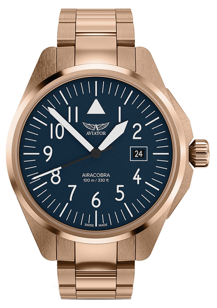 Pozlacené náramkové hodinky Aviator Airacobra 43 Type A V.1.38.2.317.5 vynikají nejen svou pevnou konstrukcí, ale také spolehlivostí a precizností ovládání, kterou se vyznačuje každý model švýcarské značky Aviator. Pouzdro o průměru 42.80 mm, vyrobené z nerezové oceli, představuje elegantní odstín růžového zlata PVD zajišťující nejen estetiku, ale také odolnost vůči vnějším faktorům. Ergonomická korunka umožňuje pohodlné nastavení času a zároveň přidává do leteckého designu výrazný prvek. Šroubovací kryt uzavírající zadní stranu hodinek zajišťuje voděodolnost do hloubky 100 metrů, což z nich dělá nenahraditelného společníka při každodenních aktivitách.