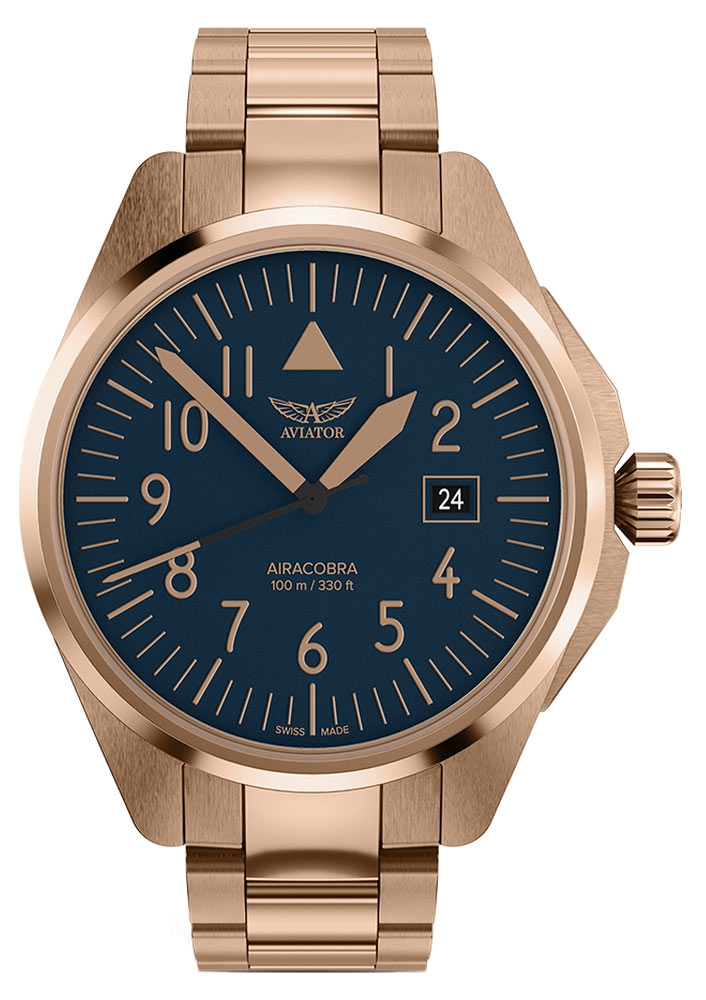 Pozlacené náramkové hodinky Aviator Airacobra 43 Type A V.1.38.2.318.5 vynikají nejen svou pevnou konstrukcí, ale také spolehlivostí a přesností ovládání, kterou se vyznačuje každý model švýcarské značky Aviator. Pouzdro o průměru 42.80 mm, vyrobené z nerezové oceli, představuje elegantní odstín růžového zlata PVD zajišťující nejen estetiku, ale také odolnost vůči vnějším faktorům. Ergonomická korunka umožňuje pohodlné nastavení času a zároveň přidává do leteckého designu výrazný prvek. Šroubovací kryt uzavírající zadní stranu hodinek zajišťuje voděodolnost do hloubky 100 metrů, což z nich dělá nenahraditelného společníka při každodenních aktivitách.