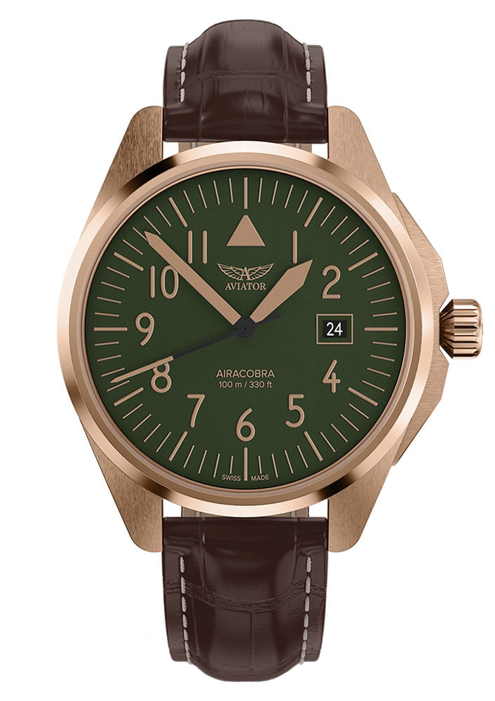 Quartzové hodinky Aviator Airacobra 43 mají zelený ciferník v leteckém stylu. Ručičky a indexy pokryté luminiscencí Swiss Super-LumiNova® zaručují perfektní čitelnost v kteroukoli denní i noční dobu. Datumovka umístěná na třech hodinách usnadňuje sledování aktuálního data a zároveň klade důraz na funkčnost tohoto modelu. Celé to chrání safírové sklíčko odolné proti poškrábání, navíc opatřené antireflexní vrstvou, která zajišťuje čistotu čtení i za ztížených světelných podmínek.
