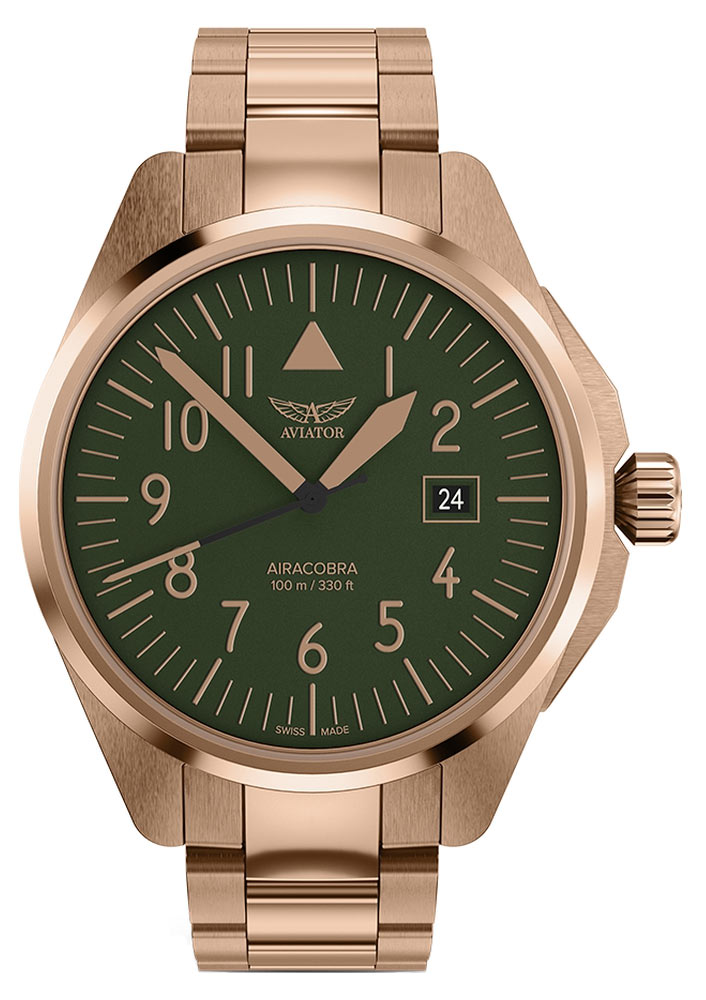 Pozlacené náramkové hodinky Aviator Airacobra 43 Type A V.1.38.2.330.5 se vyznačují nejen pevnou konstrukcí, ale také spolehlivostí a precizností ovládání, kterou se vyznačuje každý model švýcarské značky Aviator. Pouzdro o průměru 42.80 mm, vyrobené z nerezové oceli, představuje elegantní odstín růžového zlata PVD zajišťující nejen estetiku, ale také odolnost vůči vnějším faktorům. Ergonomická korunka umožňuje pohodlné nastavení času a zároveň přidává do leteckého designu výrazný prvek. Šroubovací kryt uzavírající zadní stranu hodinek zajišťuje voděodolnost do hloubky 100 metrů, což z nich dělá nenahraditelného společníka při každodenních aktivitách.