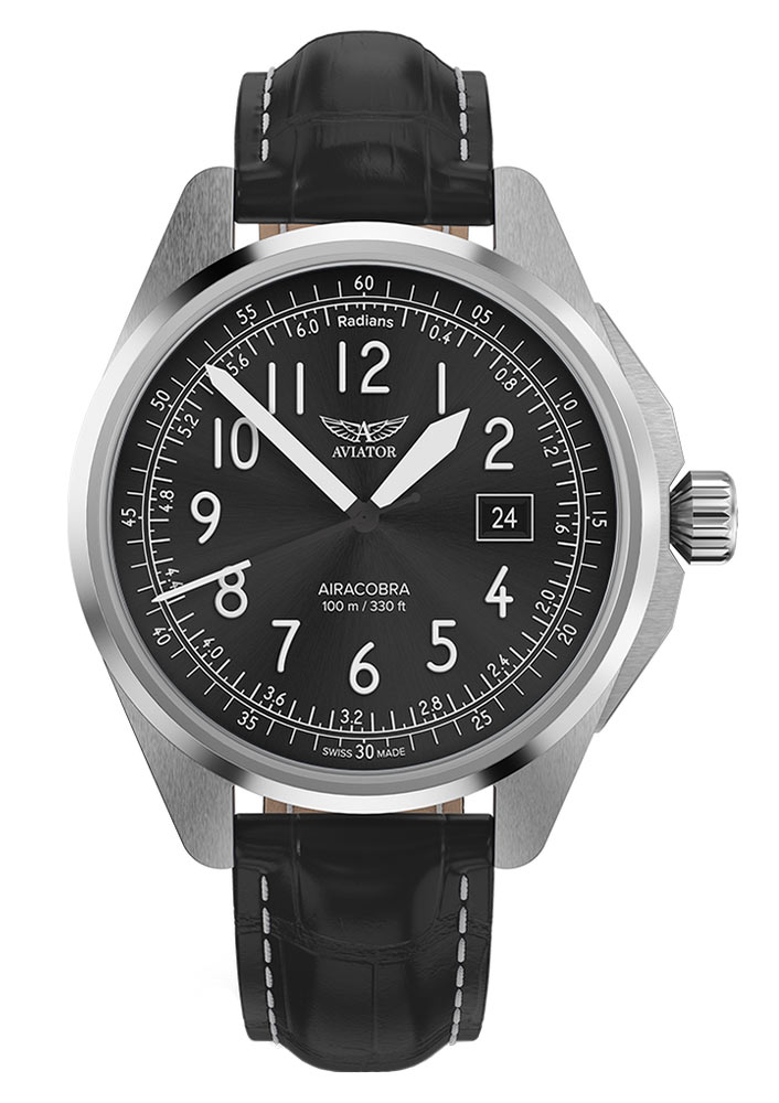 Hodinky Aviator Airacobra 43 Type B V13803224 jsou kvintesencem funkčnosti a stylu, který je vidět v každém detailu. Černý číselník v leteckém stylu s radiánovou stupnicí dodává charakter, zatímco ručičky a indexy pokryté švýcarskou luminiscencí Super-LumiNova® zaručují čitelnost za všech okolností. Radiánová stupnice na hodinkách může být užitečná pro měření času v úhlových jednotkách. Okno s datem ve 3 hodiny usnadňuje sledování data a přidává funkce. Celé to kryje safírové sklíčko odolné proti poškrábání s antireflexní vrstvou, zajišťující čistotu i ve ztížených světelných podmínkách.