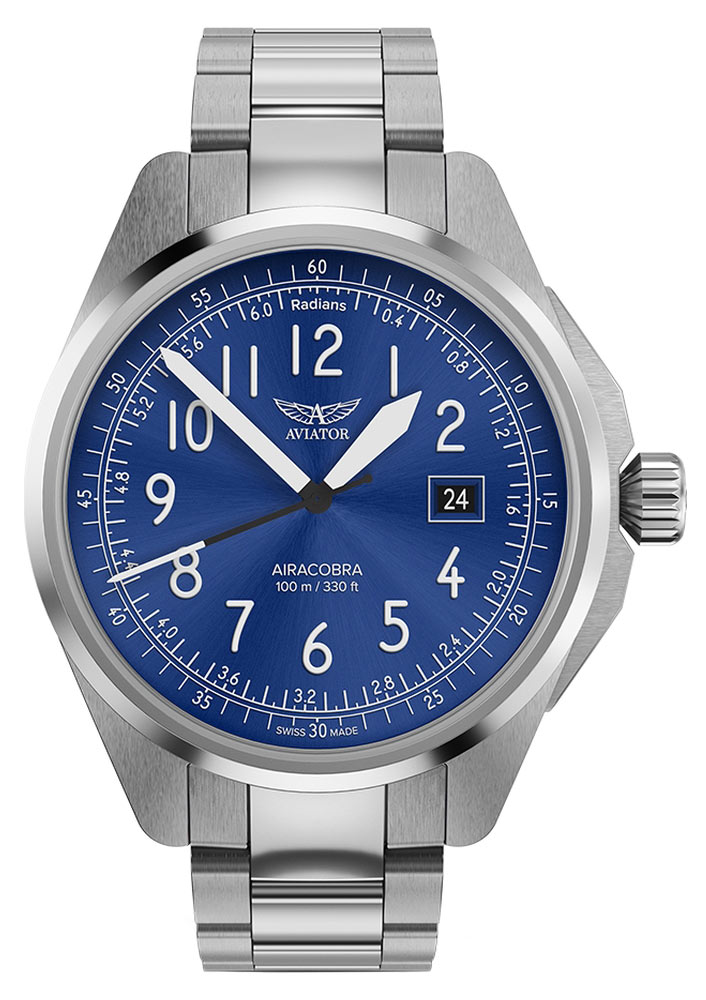 Hodinky Aviator Airacobra 43 Type B V13803255 jsou kvintesencem funkčnosti a stylu, který je vidět v každém detailu. Modrý ciferník v leteckém stylu s radiánovou stupnicí dodává charakter, zatímco ručičky a indexy pokryté bílou luminiscencí Super-LumiNova® Swiss made zaručují čitelnost kdykoli. Radiánová stupnice na slunečním ciferníku může být užitečná pro měření času v úhlových jednotkách. Okno s datem ve 3 hodiny usnadňuje sledování data a přidává funkce. Celé to kryje safírové sklo odolné proti poškrábání s antireflexní vrstvou, zajišťující čitelnost i za ztížených světelných podmínek.