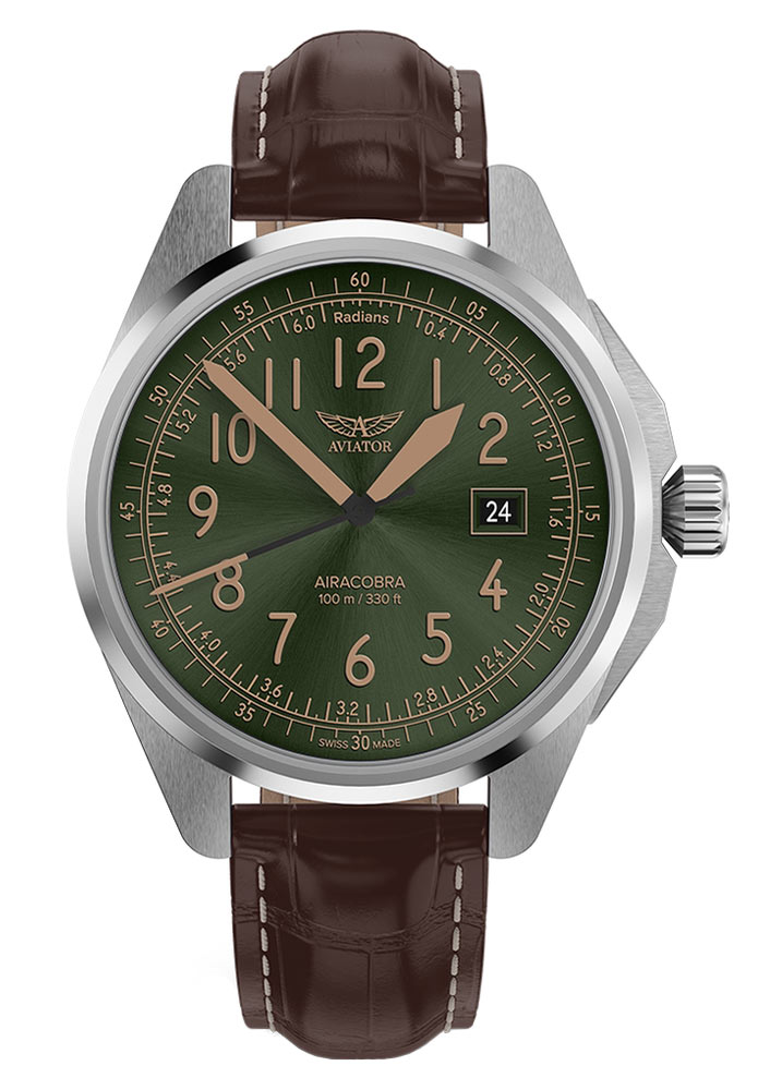 Hodinky Aviator Airacobra 43 Type B V13803294 jsou kvintesencem funkčnosti a stylu, který je vidět v každém detailu. Zelený číselník v leteckém stylu s radiánovou stupnicí dodává charakter, zatímco ručičky a indexy pokryté luminiscencí Super-LumiNova® Swiss made zaručují čitelnost kdykoli. Radiánová stupnice na slunečním ciferníku může být užitečná pro měření času v úhlových jednotkách. Okno s datem ve 3 hodiny usnadňuje sledování data a přidává funkce. Celé to kryje safírové sklíčko odolné proti poškrábání s antireflexní vrstvou, zajišťující čistotu i ve ztížených světelných podmínkách.