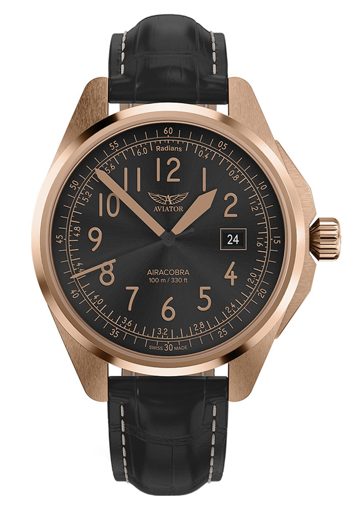 Pozlacené pánské hodinky Aviator Airacobra 43 Type B V.1.38.2.323.4 jsou příkladem elegance spojené se spolehlivostí, navozující ducha letectví v každém pohybu ručiček. Vyrobeno z masivní nerezové oceli o průměru 42.80 mm, v růžovo-zlaté barvě, zaujme nejen estetikou, ale i odolností, chránící přesný mechanismus proti vnějším vlivům. Ergonomická korunka na pravé straně nejen dodává charakter, ale také usnadňuje ovládání a zdůrazňuje letecký design. Proti vodě do 100 metrů jsou hodinky chráněny ocelovým šroubovacím krytem uzavírajícím zpátečku.