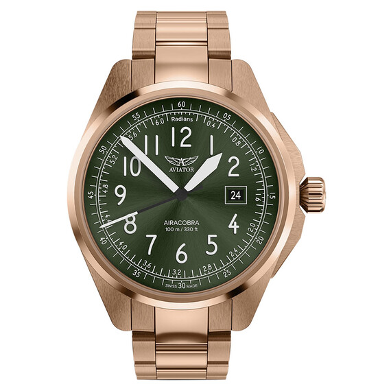 Hodinky Aviator Airacobra 43 Type B V13823245 jsou kvintesencem funkčnosti a stylu, který je vidět v každém detailu. Zelený číselník v leteckém stylu s radiánovou stupnicí dodává charakter, zatímco ručičky a indexy pokryté bílou luminiscencí Super-LumiNova® Swiss made zaručují čitelnost kdykoli. Radiánová stupnice na slunečním ciferníku může být užitečná pro měření času v úhlových jednotkách. Okno data ve 3 hodiny usnadňuje sledování data a přidává funkce. Celé to kryje safírové sklo odolné proti poškrábání s antireflexní vrstvou, zajišťující čitelnost i za ztížených světelných podmínek.