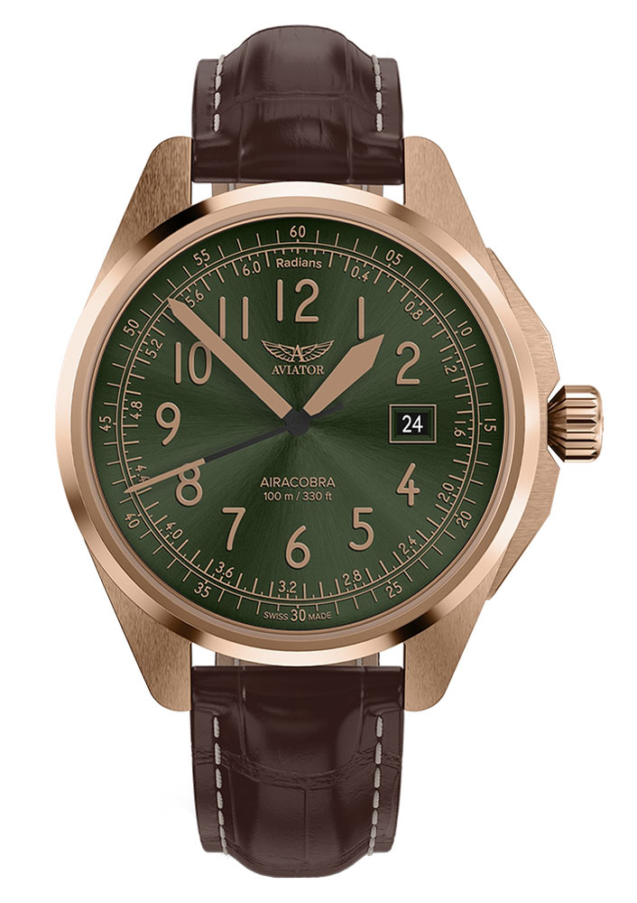 Hodinky Aviator Airacobra 43 Type B V13823294 jsou kvintesencem funkčnosti a stylu, který je vidět v každém detailu. Zelený číselník v leteckém stylu s radiánovou stupnicí dodává charakter, zatímco ručičky a indexy pokryté luminiscencí Super-LumiNova® Swiss made zaručují čitelnost kdykoli. Radiánová stupnice na slunečním ciferníku může být užitečná pro měření času v úhlových jednotkách. Okno s datem ve 3 hodiny usnadňuje sledování data a přidává funkce. Celé to kryje safírové sklíčko odolné proti poškrábání s antireflexní vrstvou, zajišťující čistotu i ve ztížených světelných podmínkách.