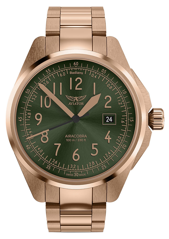Pozlacené pánské hodinky Aviator Airacobra 43 Type B V.1.38.2.329.5 jsou ukázkou elegance spojené se spolehlivostí, navozující ducha letectví v každém pohybu ručiček. Vyrobeno z masivní nerezové oceli o velikosti 42.80 mm, v elegantní růžovo-zlaté barvě, zaujme nejen estetikou, ale i odolností. Ergonomická korunka na pravé straně nejen dodává charakter, ale také usnadňuje ovládání a zdůrazňuje letecký design. Výrobce tento model zkombinoval s ocelovým, pozlaceným náramkem, který se zapíná na motýlkovou sponu. Hodinky Aviator jsou chráněny proti vodě až do hloubky 100 metrů ocelovým šroubovacím krytem na zadní straně pouzdra.