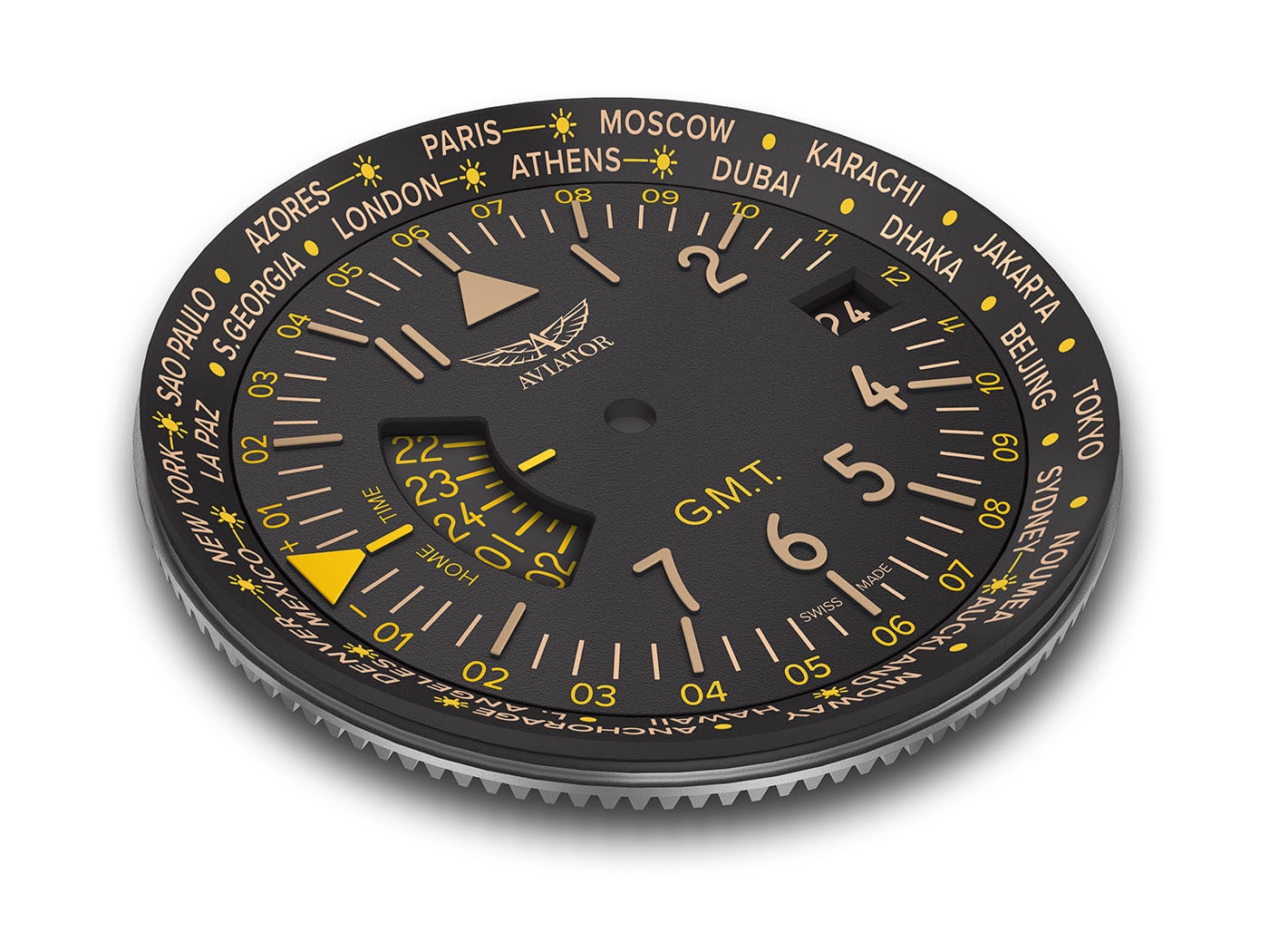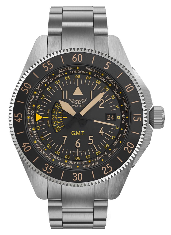 Pod těžko poškrábatelným antireflexním safírovým sklíčkem se skrývá černý ciferník bohatý na funkce. Na vnější části štítu je stupnice s městy z celého světa. Hodinky mají funkci 24hodinového druhého časového pásma a funkci světového času ovládanou otočnou lunetou. Ve 3 hodiny je datumové okno s aktuálním dnem v měsíci. Výrobce usnadňuje odečítání času i v naprosté tmě díky podsvícení Super-LumiNova .