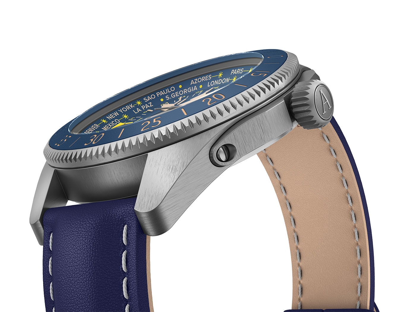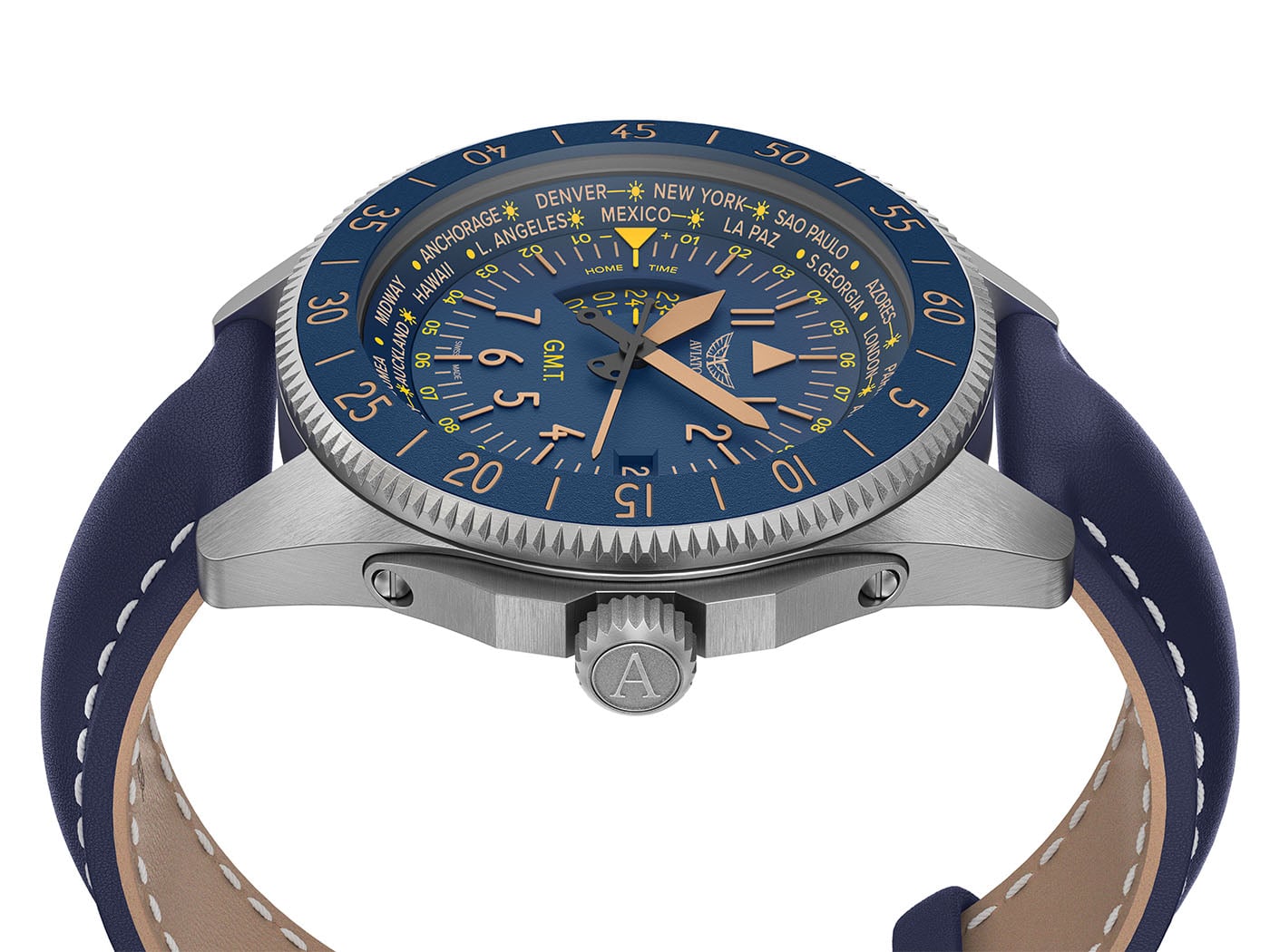 Pod těžko poškrábatelným antireflexním safírovým sklíčkem se skrývá modrý ciferník bohatý na funkce. Na vnější části štítu je stupnice s městy z celého světa. Hodinky mají funkci 24hodinového druhého časového pásma a funkci světového času ovládanou otočnou lunetou. Ve 3 hodiny je datumové okno s aktuálním dnem v měsíci. Výrobce usnadňuje odečítání času i v naprosté tmě díky podsvícení Super-LumiNova .