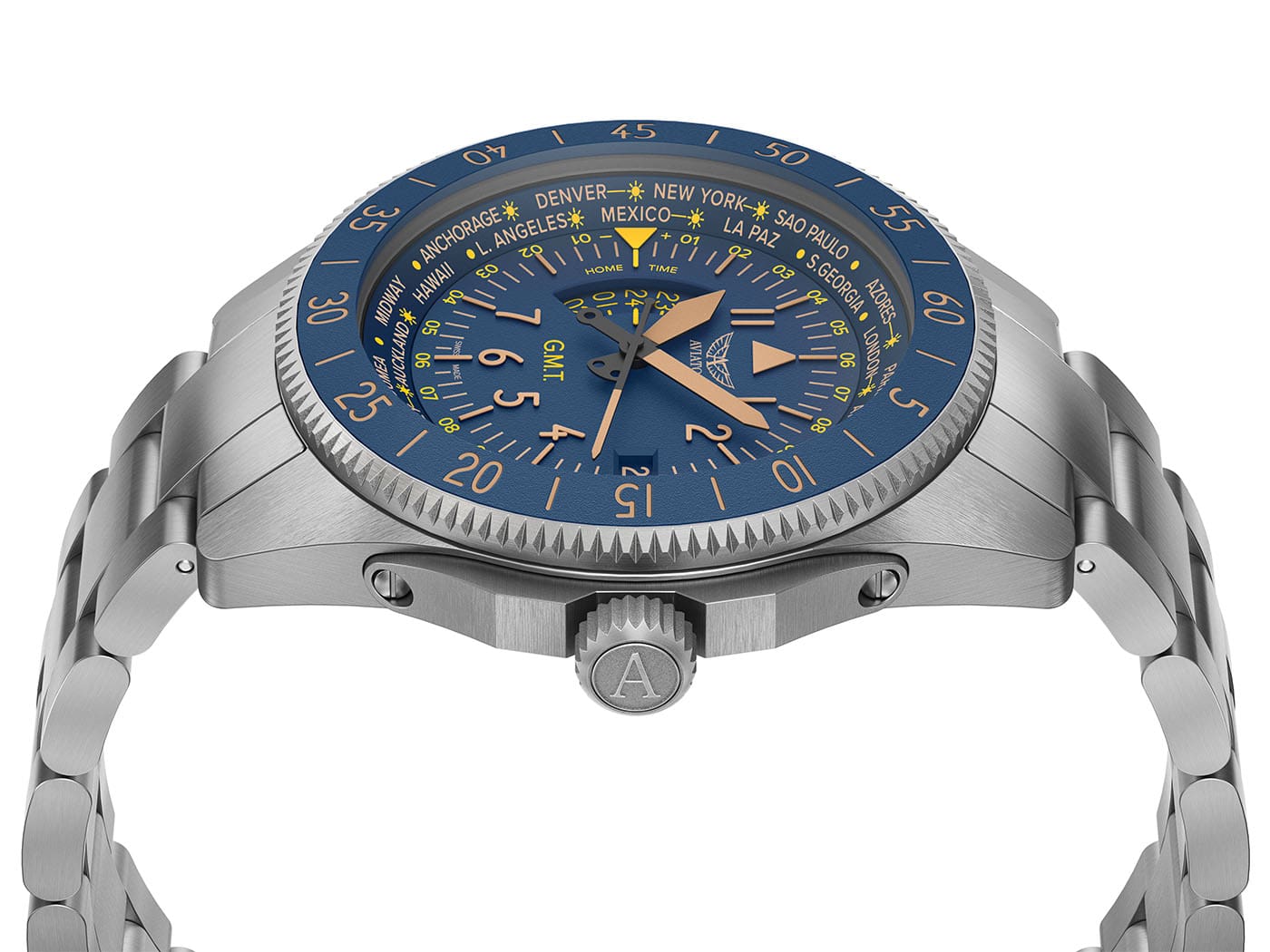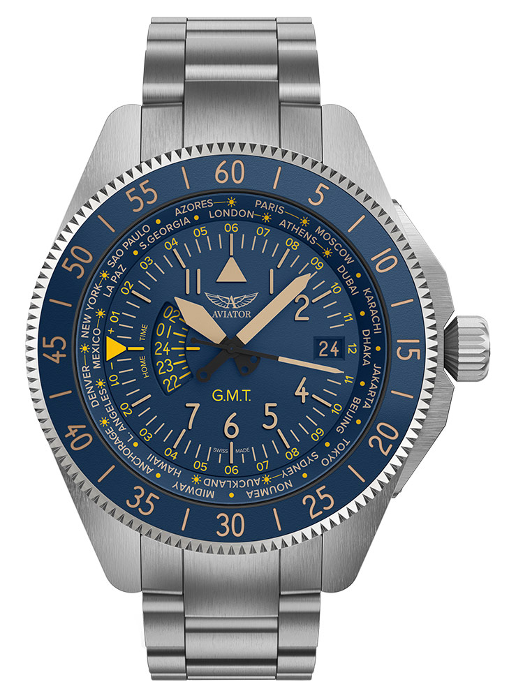 Pod těžko poškrábatelným antireflexním safírovým sklíčkem se skrývá modrý ciferník bohatý na funkce. Na vnější části štítu je stupnice s městy z celého světa. Hodinky mají funkci 24hodinového druhého časového pásma a funkci světového času ovládanou otočnou lunetou. Ve 3 hodiny je datumové okno s aktuálním dnem v měsíci. Výrobce usnadňuje odečítání času i v naprosté tmě díky podsvícení Super-LumiNova .
